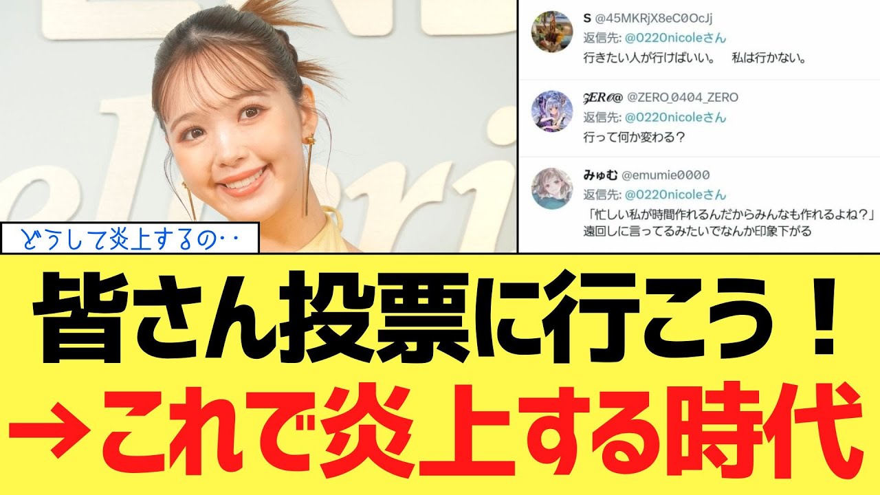 若者に絶大な人気を誇る藤谷コさんが選挙 について発言しただけで炎上しています。 投稿内容はシンプル。忙しくても投票の 時間は作れるよう。行きたい人は言ってね 。それだけです。ところがネット上では圧 をかけるな偉そうといった批判が相 のSNSは一部ユーザーからの攻撃に さらされました。なぜ投票に行こうという だけで炎上するのでしょうか?この現象の 背景にあるのは日本の若者の政治参加率の 低さとその根底にある政治への無力感や 諦めです。2021年衆議院選挙では20 代の投票率はわずかだ36.5%、前年大 平均が55%台であることを考えると約に 10ポイントも低いのが現状です。なぜ これほど差があるのか。内閣府が公表した 18歳意識調査によると自分の一票では何 も変わらないと思うと答えた若者は実に約 68% つまり投票しても無駄という思い込みが 多くの若者を選挙から遠ざけているのです 。ですが実際には一票の重みは想像以上に 大きい。2023年の地方選挙では投票 査わずか300票以下で到落が決まった 事例が全国に24件も存在します。また弱 年層の投票率が低いことによって高齢者の 意見が政策に反映されやすくなるシルバー 民主主義も進行しています。藤谷コルさん のような影響力のある人が投票しようと 呼びかけることでこの空気を少しでも 変えようとしている。それを黙っていて 欲しいとたくのは言論の自由そのものを 移縮させかねません。として何より政治を 語ることを偉そううさ臭いという空気こそ が政治を遠ざけ生活に不満を抱えながらも 変化を諦める社会を作っています。もし あなたが変えたいと少しでも思っている ならまずは1票から始めてみませんか? このチャンネルではニュースの裏がわ社会 の構造を分かりやすく解説しています。気 になった方は是非チャンネル登録をお願い します。