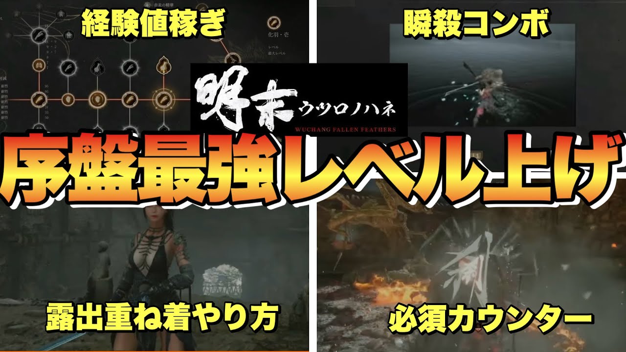 はい、え、どうもちかです。え、今日も ですね、うろの羽のですね、え、攻略やっ ていこうと思います。え、今日はですね、 え、こちら装備の重ねぎのやり方とか、 あとはですね、戦闘において、え、おすめ のですね、え、やり方、あとはレベル上げ に関してですね、え、序盤の序盤、え、 詰まってしまった方のためのおすすめの ルートとか紹介していこうと思います。 はい。え、そしたらまずは、え、スキンの 方から見せていきます。オプションボタン を押していただいて、え、武器の装備画面 があるんですけど、今現在装備しているの は、え、初期装備ですね。え、この鎧いと かを装備してるんですけど、え、この鎧い の、え、見た目を変えてます。で、どう やって変えてるかって言うと、R1を押す とですね、え、こちらのですね、え、箱が あるわけですけど、さらにR2を押して いくと、え、各種武器とかあとは防具が出 てきます。で、ここで見た目を変えること ができて、例えばこの鎧いですね。え、見 た目を変えたい鎧いを選びます。え、で、 現在装備しているのがこの初期鎧いなん ですけど、外観の変更っていうのがあり ます。で、外観の変更をした後に、え、 自分のですね、え、好きな衣装に、え、 押してみるっていうところですね。え、 そうするとはい。え、こんな感じですね。 衣装が、え、切り替わるって形です。はい 。なのでここでですね、いろんな衣装に、 え、変えることができるって感じです。ま 、こういう忍者系のやつも、え、これも 結構かっこいいですよね。で、初期で胸が パッカン開いてるのだとこの白と黒のやつ かな。で、え、ま、黒と白で肌の色とかが 変わるですね。黒だと通常の、え、無常の ね、え、肌色。白にすると、え、黒色の ですね、え、肌色にすることができます。 好きな方にしてみてください。え、ちなみ にこれね、かなり胸が揺れるのでおすめ です。で、足装備に関しても、え、各V ですね、え、見た目が変えることができて 、足もですね、この、え、包帯系にね、え 、したりとか、ま、こちらはズボとかなの で、ま、あんまり露出が少ないんですけど 、こっちだとですね、なんかパンチみたい な感じになるので、え、使ってみるといい かもですね。はい。え、こんな感じになり ます。え、下側からアングルでね、え、 覗こうとすれば覗ける、え、描写にはなっ てるかなと思います。ま、今作はソウル ライクではあるんですけど、中でもね、 ステラブレードと同じでちょっとこう露出 の高い衣装があるっていうのが特徴なんで 、やっぱここは抑えておきたいとこですね 。はい、続いてレベル上げ周回ですね。 レベル上げに関しては基本的にこの3敗の ところで、え、夢にカ路を押して いただければ敵がですね、何度も何度も 復活するっていうところで、もう本当に最 のところはもうここですよね。神社降りて 、え、最初の3体の、え、敵、え、ここを 早々に買ってくっていうところで、え、 まずはね、レベル23とかちょっと上げ てくと、え、またこうクリアーがしやすく なるので、え、おすめだったりしますね。 はい。で、え、ここもなんか元々HPが 減ってるので即倒しやすいかつ、え、 アイテムがですね、え、こんな感じで 落としてくれます。で、落としたアイテム に関しては、え、経験値素材とかですね、 え、こういう経験値素材も落としてくれる ので、序盤はですね、とにかく、え、ここ の3体ですね、買ったら、え、戻ってくっ ていう形で、ま、本当に、え、レベル、え 、3とか、え、まずはやってみると、え、 進みやすいかもですね。え、必ず戻ってき て、え、レベルが上げられる状況になっ たらこう光ってますんでね。え、光ってる ので、え、バツボタンを押してレベルを 上げていきます。で、レベルを上げたら、 え、必ずですね、スキルをですね、上げる 素材がもらえるので、例えばこういう、え 、左側のですね、回復系ですね、回復系の アイテムがあるので、え、回復の回数を 増やしたりとか、ま、ここら辺があると、 ま、結構おすすめですね。ま、今回は回復 量の増加があるので回復量を増やしてくっ てとこですね。え、タイミングによって こういう、え、回復量の、え、数を増やし たりとかですね。ま、今回ちょっと戦技系 のですね、え、バフ系アイテムの、え、 速度を上げるやつもつけておきます。はい 。で、あとはそれ以外にファストトラベル 飛びながら次のですね、レベル上げにお すめなところがはい。え、こちらのですね 、ストーリー上中ボスぐらいが出てくる やつですね。このステージがやりやすいか な。え、ここに参拝があって、で、雑魚敵 がいるのが1つはここ入って右側ですね。 え、で、座ってるので、え、処理しやす いっていうのが1つあるかな。え、簡単に 処理できると。で、もう1体がこう食っ てるので、え、そいつを、え、また、え、 攻撃するってところで、ここら辺はね、隙 が大