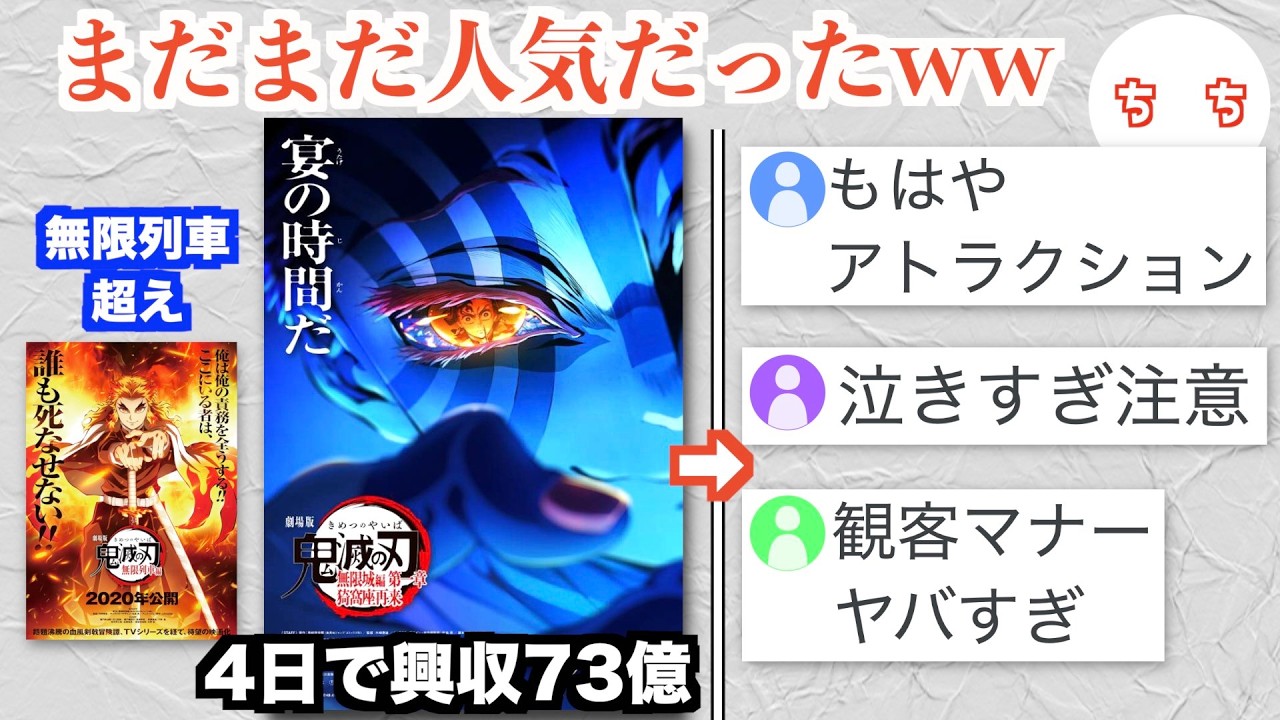 鬼滅の刃の映画見る際の注意事項がカオス になるということで見ていたと思います。 皆さん鬼滅の刃は好きでしょうか?もう 鬼滅の刃は主人公の炭治郎が鬼を切って いく作品なんですが、ま、鬼滅の刃、 コロナの時期にね、むちゃむちゃ流行った 印象があるんですが、ま、そんな鬼滅の刃 の劇場版が7月18日から公開され、ま、 それが鬼滅の刃無限上編第1章赤座最来 ですね。煉獄さんを殺した鬼がね、再来 するというタイトルなんですが、こちらの 映画がどうやら公開3日間で工業収入 55.2億円を突破し、ま、これが前作の 2020年の煉獄さんのね、鬼滅の刃無限 列車編の初集録を超える公衆ペースだそう で、ま、この無限列車編が国内歴代1位と なる工業収入404.3億円 を突破しているみたいで、ま、その歴代1 位の無限列車編を超えるペースみたいです ね。で、こちらの映画が日本で公開された 映画市場でオープニング成績、初日成績、 単日成績の3つの記録を更新したよで。で 、さらに今年公開された大ヒット作品名 探偵コナン石眼のフラッシュバック。ま、 こちらが公開3日で34億円なんですが、 ま、それと比べても今回の機密の刃の方が 結構上回っていて、で、このコナンが現在 144億円らしいんですが、今回の鬼密の 刃がこの記録を超えるのは確実で今年1番 の大ヒット映画になりそうだと言われる ぐらいもうすごい勢いで始まったみたい ですね。ま、映画館でもね、何スクリーン も使って鬼滅の刃を朝から晩まで上映して いたり、ま、あとは前作の無限列車編が コロナ中だったんで入場制限があったそう で、で、物理的に観客同演数は不利なん ですが、ま、それでも人気のピークが過ぎ たと思われていた鬼滅の刃でこのペースで 映画が見られているということで驚かれて いるみたいですね。で、そんな鬼滅の刃の 今回の映画を見に行った人の感想が結構 いろんな感想があってカオスだということ で、ま、例えば泣きすぎ注意ですね。べが 泣いたみたいな感じかもしれませんが、ま 、どうやらむちゃむちゃね、感動すると いうか、泣いてしまうような内容という ことで、服の袖が微しびしになるほど涙し ただたり、終盤のストーリーが耐えきれ なくて、お越えするほど泣いたという感想 があって、もうハカ値1枚じゃ足りない から、もうタオルを持っていった方がいい みたいなコメントもありません。で、 さらに原作を読んでいてこれから見に行く 人のコメントとしては、ま、どうやら原作 でも今回の映画の内容の場面は涙しては見 られないところだそうで、とにかくハ価値 はもちろんティッシュ1箱必要かなと思っ てます。というね、ティッシュ1箱を持っ ていくというコメントもありません。もう さすがにティッシュ1箱はね、邪魔になる んじゃないかというね、もうこれは胡長 さんも突っ込みたくなる嘘柱なんじゃない かと思うんですが、ま、でも泣いたという ね、感想が多いですね。ま、本当にね、 こんなみんなが言うほど泣くのかどうかを 確認するためにね、僕も見に行ったという か、ま、普通に見に行く予定だったんで見 に行ったんですが、ま、僕はね、原作を 読んでなくてアニメは全部見て行ったん ですが、ま、前回の無限列車編のね、やつ では炭治郎が鬼に向かって煉獄さんは負け てないぞ、逃げるなみたいなそのシーンで ね、ちょっとうるうるしちゃうぐらいの涙 体制なんですが、ま、今回のこの無限上編 もね、結構危なかったですね。ま、鬼滅の 刃、ってね、炭治郎だったりね、 キャラクターが泣くシーンも結構あると 思うんですが、ま、そういった キャラクターが泣くのに釣られて泣きそう になっちゃうね、シーンがありましたね。 で、特に終盤ですね。コメントでも終盤が やばいみたいなコメント多かったんですが 、もう終盤は僕の横のね、知らない女の人 がボロ泣けしてましたね。で、他の席から も鼻をすする音も結構聞こえてきたんで、 もう泣いてる人ね、結構いましたね。ま、 でも僕はね、その横の女の人が泣いてたん で、それで逆になんか冷静になってギリね 、耐えることができましたね。ま、なんで 涙の量はね、人によると思うんですが、ま 、さすがにハカ値がね、あればティッシュ 1枠はいらないんじゃないかと思いました ね。で、さらに他にもマナー違反の客がい たという感想も結構あるよで、ま、どう やら公開後すぐ3連休だったということで 、普段映画館に来ないそうの人たちも起き てルール違反をしていたとコメントって、 ま、例えば小学青春集団が上映中 うるさかっただったり、上映中にスマホで 時間を確認してその光が鬱陶しかっただっ たり、ま、さらに最後のエンドロールが 始まったら多くの人が出ていこうとして 画面が見づらかったというコメントもあっ 人が少ない夜の最終上映に行った方がいい と提案する人もいますね。ま、僕は3連休 中のおそらく人が1番多いお昼に行ったん ですが、ま、客席も満員だったんですが、 そこま