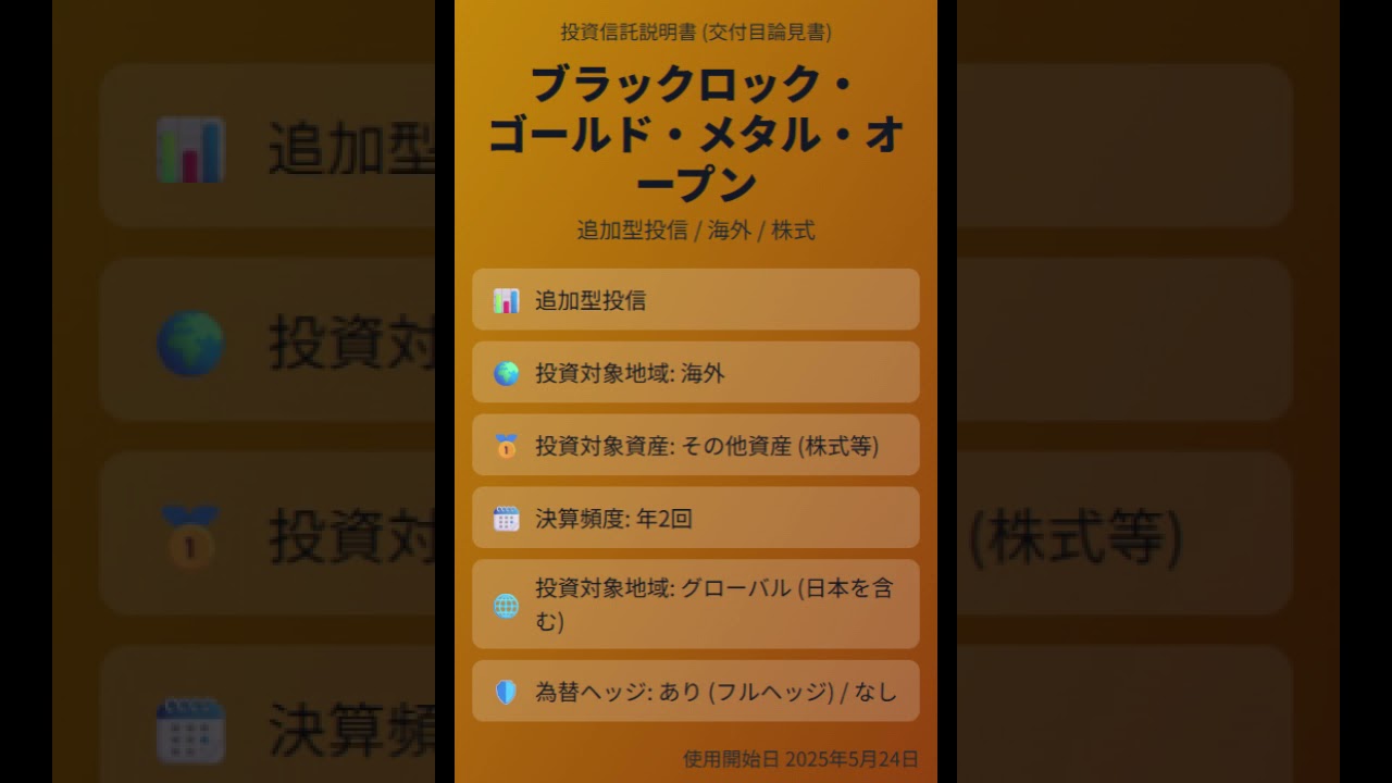 こんにちは。コム台のディープダイブです 。今日はですね、あなたから共有いただい たこの資料ブラックロックゴールドメタル オープン。えっと、2025年5月24日 付けの投資信託説明書ですね。これを 深掘りしていきたいと思います。Aコース ヘッジ付きとBコースヘッジなし。この2 つがあるんですね。今回のミッションは このファンドがま、どういうものなのか。 特に均衡株への投資戦略とかリスク、あと はそのコースの違いですね。これをサクっ と掴むことです。委託会社は ブラックロックジャパン、住宅会社は野村 信託銀行とでは早速いきましょうか。まず このファンドそもそも何を目指しているの か。説明書によると目的はシンプルに信託 財産の成長ですね。で、その主な投資対象 が、え、南アフリカ、オーストラリア、 カナダ、米国なんかのいわゆる均衡株、 近郊企業の株式が中心ということですね。 他の工業株も少し入るけどメインは金。 銘柄選びなんですけど、これは各企業の金 の埋蔵量とか3金のコスト、これを分析し て割安と判断したものにこう厳選して投資 するスタイルと、あと金価格とかに連動 する投資信託証券に投資することもあると 書いてますね。え、そうですね。 ここでやっぱり気になるのがなんで金そのものじゃなくて均衡株なんだってとこですよね。 ああ、確かに金に投資するなら普通自考えますもんね。 ええ、まず1 つは金価格との連動性がある程度期待できる点です。均行株の価格っていうのはやっぱり金の価格と同じ方向に動きやすい傾向があるんですね。 金が上がれば企業の収益も増えやすいと下がればその逆まそういうイメージです。 なるほど。 ただここがあのすごく重要なんですけど金行株は金そのものではないんですよ。 ほう。違う。 はい。金の価格変動要因例えばま、世界 情勢とかインフレ懸念需要とかそういうの に加えて均衡は株式ですからその会社の 業績であるとか経営あとは株式市場全体の ムード金利こういった株価の変動要因にも 左右されるわけです。ああ、なるほど。金 価格が上がっても会社の問題とか市場全体 がダメなら株価は上がらないかもしれな いってことですね。 おっしゃる通りです。逆に金価格が横倍でもものすごく効率的な経営をするとか何か良いニュースがあれば株価は上がる可能性もある。 うーん。金の投資より 1 段階要因が多いというか複雑なんですね。 ええ、そう言えますね。もう 1 つ近郊株ならではの点としてやっぱり株式であることのメリット、つまり経営努力ですね。 例えば生産コストを下げるとか新しい有望な鉱脈を見つけるとかそういうことで企業価値そのものが上がる期待があるわけです。 ああ、それは金にはない要素ですね。 まさにこれは金そのものにはない点です。もちろん株式市場全体がすごく不調だったらいいら金価格が好調でも株価は下がってしまうなんてこともありえます。 資料にもありますが、ブラックロックとしては過去のデータを見ると世界株式とか債権との相関が低い傾向があるということで資産分散の一環としての可能性も示唆してますね。 なるほどな。金と似ているようでやっぱり違側面が大きいとよくわかりました。では次に AコースとB コースありとなし。これはどう考えたらいいんでしょう?まず Aコースがせヘッ付きですね。 はい。 これは実質的に外貨建ての資産、ま、主にドルとか 5 ドルとかになると思いますが、それに対してヘッジを行うことで買わせ変動のリスクをできるだけ抑えようというコースです。 うん。うん。 ただ注意点としてヘッジ対象の通貨、例えば米の金利が日本円の金利より高い場合ですね。その金利差相当分のコスト、いわゆるヘッジコストがかかることがあります。 ああ、保険料みたいなものですね。 為せリスクを抑えるにコストがかかるかもしれないと。 そういうことです。0 コストとは限らないと。一方の B コースはせへなし。ええ、原則としてヘッジを行わないのでレートの動きが良くも悪くも直接基準価格に影響します。 円安になればプラス効果、円高だとマイナス効果。 はい。 ですからご自身が買わせをどう考えるか、リスクを取ってリターンを狙うか、あるいはコストを払ってでも買わせ抑えたいか、そこで選ぶことになりますね。 ちなみにこの2 つのコース感は手数量なしで乗り換えスイッチングができるんですね。 ええ、これは便利ですね。ただし注意点があってスイッチングは実質的には 1 度売却してもう一方を買い直す形になりますから。 ああ、そうか。 なので、もし乗り換える時に利益が出ていればその利益に対しては税金がかかるという手は覚えておく必要がありますね。なるほど。税金は別と仕組みはファミリーファンド方式って書いてますね。これは ああ、はい。これは投資家、つまりあなた が直接このファンドの均衡株を買うわけ じゃなくてですね、あなたが投資するA コースとかBコース、これをベビー ファン