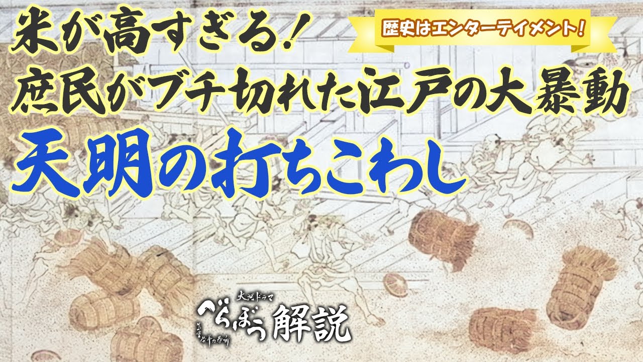 天明の大飢饉により大量の流民が江戸に流れ込んできて治安が急激に悪化。ついに大規模な打ちこわしが起こります。天明の打ちこわしがどのようなものだったのか、それに対して幕府がどんな対策をとったのか解説しています。