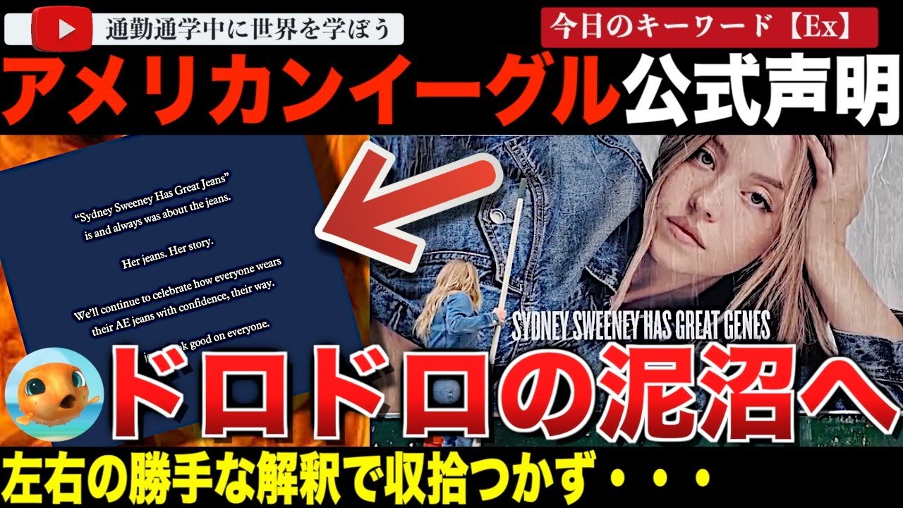 [音楽] I’mnotheretotellyou toAmericanEagle andIwonsaythe comfortableever make that ifyoubuythejeansnot stopyou thisisnotmetelling you seewhatIdid 通勤通学の皆様おはようございます。の 世界自じニュースのお時間です。さあ、 本日はですね、以前もお伝えしました アメリカンイーグル騒動の続報となってい ます。あれからもですね、この騒動金化 するどころか激してしまっておりまして、 もう大変なことになってしまっています。 で、今回の件を受けましてアメリカン イーグルも公式生命というのを出しまして 、さらにはですね、このシドニースイニー が共和党に登録されていたということも 発覚したものですから、現在ですね、これ 完全に左右を分断する政治の話になって しまっているんですね。本日は一体何が 起きているのか詳しく見ていきたいと思い ます。この番組は海外のほっとなじじ ニュースをお届けします。通勤通学のお共 にちょうどいいチャンネルとなってますの で是非チャンネル登録お願いします。さあ 、それでは本題です。こちらね、見えて おりますが、以前こちらの動画で見ました アメリカンイーグルの広告騒動ですね。 アメリカのブランドがそのジーンズの広告 にハリウッド女優、シドニを起用しました 。そしてこの広告というのが優勢思想に 基づいたものなのではないか。ま、この ように言われまして一部界隈がね、発狂し たというような状態になっていたんですね 。するとそれを受けまして今回ねこのよう になりました。アメリカンイーグルは白ニ スイニーの広告を巡る批判に対し最初から ずっとジーンズの話だったと回答。 ティ務系氷業者のアメリカンイーグル アウトフィッターズは27歳の俳優シドニ を起用したデニム広告のキャンペーンを 巡り、人種や西洋的な美の基準についての 議論を呼んだことに意義を唱える人々への メッセージを発信した。このキャンペーン は同社に俺は最初からずっとジーンズに ついてのものだったという。つまりこの ジーンズというのはキルホのジーンズ。 最初からこの話をしているんですよと。ま 、このように言っているというんですね。 アメリカンイーグルは金曜日自社の Instagramアカウントに生命を 投稿。広告キャンペーンは最初からずっと 人についてのものです。彼女の人、彼女の ストーリーについてのものです。私たちは 今後も自信を持って自分らしくアメリカン イーグルのジーンズを履く姿を称えていき ます。素晴らしい人は誰にでも似合います と述べている。ということでね、それが まさにね、こちらの生命になるんですが、 今回の騒動を受けましてこのアメリカン イーグルが公式の生命を発表したんですね 。そしてね、ここに何て書かれているかと 言いますと、シドニは素晴らしいジーンズ を持っているとは最初からこう白方の ジーンズのことを言っているんだと。彼女 のジーンズ、彼女のストーリー、そして 素晴らしいジーンズは誰にでも似合います よと。このような内容だったんですね。 するとですね、ま、これを受けまして主に 星系のインフルエンサーたちはですね、 こちらにもあるんですが、アメリカン イーグルはInstagramでの生命で 広告を擁護し、白人で金髪で青い目を持つ 女性を起用したことについて人種差別的 優勢を推進していると避難するリベラル系 活動家からの反発にも屈しない姿勢を示し た。こちらもそうですね。アメリカン イーグルは決して引きませんでしたと。 そしてこちらもそうです。アメリカン イーグルが白水を擁護する初の公式生命を 発表。目覚めたサは気に入らないだろう。 謝罪は一切なしとこのようにしてですね、 アメリカンイーグルはサ覇からの攻撃には 屈しなかったぞ。決して謝罪をしなかった ぞと言ってこれを目覚めたサ覇の敗北。 我々が勝利したんだと称えたんですね。で もどうですか実際?これね、プクタが見る 限り全くそんな風には見えませんでしたね 。是非これに関してはね、皆さんご意見 伺いたいですが、福田には真逆に見えまし たというのもまさにね、この方指摘してる んですが、これですよ。以前の動画でもお 伝えしましたね。このアメリカンイーグル というのは同じくね、公式 Instagram上でここね、遺伝子と いう文字を切る方のジーンズに書き換える というこういった動画をあげてるんですね 。これ自体は高校キャンペーンの一環では なかったとは言っているんですが、少なく とも公式がこの動画をあげてるんですよ。 だから今更ね、あのジーンに遺伝子という 意味はありませんでしたと言ったところで 、じゃあこれ何だったんだって話になる でしょう。今回の生命というのはこれがね 、全く説明つかないため、この件に関して はね、多くの方が指摘しています。そして これについてはね、まさにAPにも書かれ ているんですが、人々が最も問題視したの はスイニーがこう語るティーザー動画だっ た。ジーンズは親から声と受け継がれ、 しばしば髪の色や性格、さらには