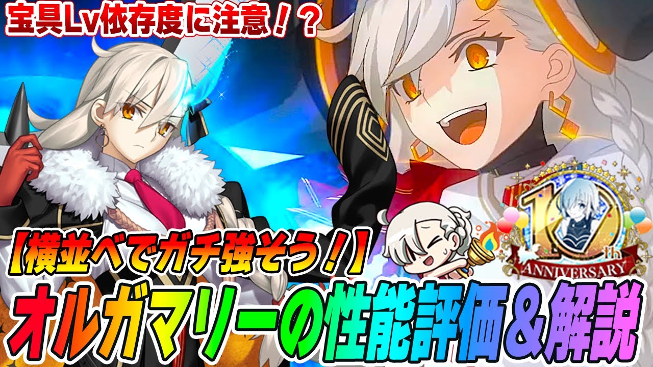 はい、どうもこりゃかんです。え、FGO 10周年おめでとうございます。 ありがとうございます。ということで、え 、執年サーバントオルガマリー アリムスフィアンビースト クラスで登場ということで、ま、一旦ね、 性能は大体理解できたかなと思いますんで 、紹介やっていこうかなと思います。それ ではもう早速本題に行っちゃいましょうか 。最高です。はい、では性能紹介していく んですけど、え、めっちゃ文章長いですし 、え、ちょっと複雑な性能をしてます。僕 自身もちょっとまだ完璧に理解はできて ないかなというところあると思いますんで 、ま、続報の動画とか配信で改めて強みと か弱みとか、え、新しい使い方だったり ありましたらまた続報でお伝えしようかな と思っております。今思ってること、特に 強いとか弱いとか分かってること、そこ だけピンポイントで集中して紹介して いこうかなと思います。はい。で、まず1 つ特徴なんですけど、クラス相性ですね。 え、こちら公式サイトに画像があります 通り、え、完全有利を取れるのがムーン キャンサー。攻撃有利で防御は不利だよっ ていうのが、え、バーサーカーと フォーリナーでアベンジャーは不利ですが 、逆に言うとそれ以外は大体等倍で戦え ますよね。で、防御有利だよね。という ことで、え、セイバーから、え、アサシン 、バーサーカー除く奈しに対しては、ま、 ほぼルーラーですよね。という、そういう 特殊なクラシになります。ビーストは アベンジャーが苦手なんですね。という ことも分かりますし、とにかくクラス最将 は、ま、優秀な方ですね。ま、正直 バーサーカーがほぼ全てに1.5倍だよ ねっていうのがあるんで、バーサーカーと 比べちゃうとちょっとそれはとなりますが 、ほぼルーラーでフォーリナーにもムーン キャンサーにも有利って考えると、ま、 有利クラスがルーラーよりも1個多いかな という感じになりますんで、ここは非常に 優秀かなと思います。で、続きまして、 これも1番重要なんですけど、最臨で性能 がガラっというほどでは実はなかったり するんですけど、結構変わります。第1, 、第2輪と、え、第3輪。この2つで スキル効果がだいぶ変わってきますんで、 それについて紹介していきます。で、順番 に見ていきますが、まずはステータス。 HPは高いですが、アタックはうん、 かなり低めと言っていい数値になります。 なのでちょっとね、火力の伸び自体は 怪しいところが残るかなという感じで、次 に一旦ホ具行くんですけど、え、全体ホ具 のバスター、え、効果敵全体の9AB、色 デバフ一旦多分20%でその後に全体一星 特攻ホ具を打ちますとオーバーチャージで 上がっていきますし、スキルで惜しいとか も持ってるんで人と星に対しては強く出 られますと。ま、人はよくね、振り越え とこにも出てくるんで、刺さりやすい側の 特攻ではあります。で、その後味方全体 攻撃少しアップ3ターンでNPチャージ、 NPチャージ。後ろの方は人星、または 今る人類限定です。で、このホ具自体は 再臨で変化しません。第1、第2どちらで 使ってもこのホ具効果は全く一緒です。 全体ホ具も固定だし、単体ホ具になると いうことはありません。ちょっとね、 プトレとかメルチーヌとかみたいに再臨 変わるとホ具もガラっと変わりますよって いうところがかなり多かったんで、そこは ちょっとね、勘違いしやすいかなと思うん でご注意ください。で、ホ具効果すげえ 強いことが書いてありまして、え、ここ ですね、味方全体の攻撃力を少しアップ3 ターンなんですけど、なんとここにレベル 表記がありまして、ホ具レベルで全体バフ の効果変わります。これがオルガマリーの 性能のすごく重要なところで、ホ具レベル を上げると横バフが増えます。ちょっと今 繰り返し言っただけになっちゃったんです けど、普通のサーヴバントってあのアルク とかトネリコみたいに特攻倍率がホ具 レベルで変化しますよとかは、あの過去に もね、周年サーバントで実装されていたん ですけど、え、普通に攻撃ホ具で横布の方 が数値変わりますよ。バフ量の方が変わり ますよっていう方はかなり珍しいですね。 え、バフ量が変わるっていうのは補助ホ具 の超人オリオンとか、えっと、ひコ、 ホームズ、ライネス、マイケルとか攻撃 ホ具持ってないサーバントはここの数値が 変わることって今までもあったんですけど 、オルガマリー普通に準アタッカーが持っ てきたものとしては多分初めてになるん ですかね。容器費の火傷とかも確かホ具 レベルで変わってましたが、全体バフが 変わるアタッカーっていうのは初になるん じゃないですかね。で、これが強くて、 あの、これがホ具レベル1だとおそらく 10%スタートで、ホ具2で20%。ホグ レベル5になると最大30%かな。この ホ具1回で横バフ渡せることになりますん で、これって強いっすよね。今って結構 横並べ周回が主流になってきてるというか 、やってみようかなってい