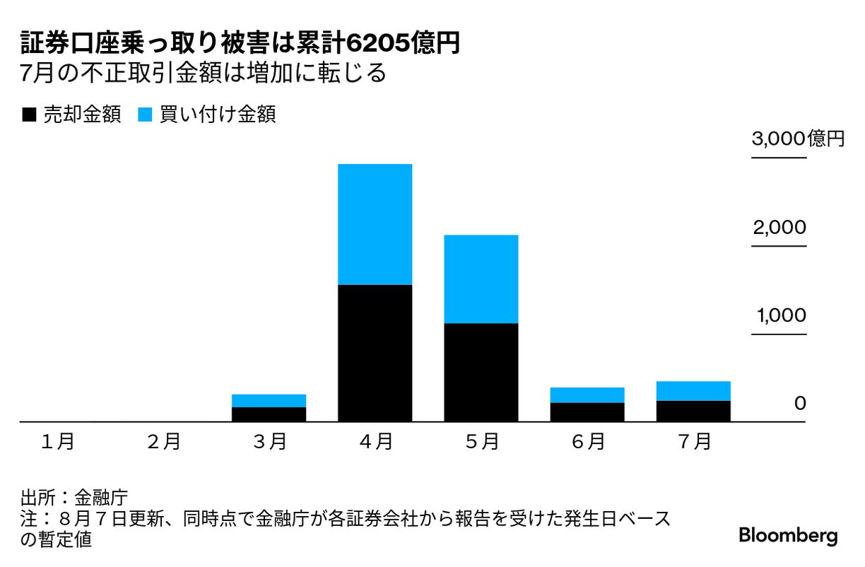 金融庁は7日、インターネット経由で証券口座が乗っ取られ、不正に取引された金額が1月から7月末までの累計で、6205億円だったと発表した。