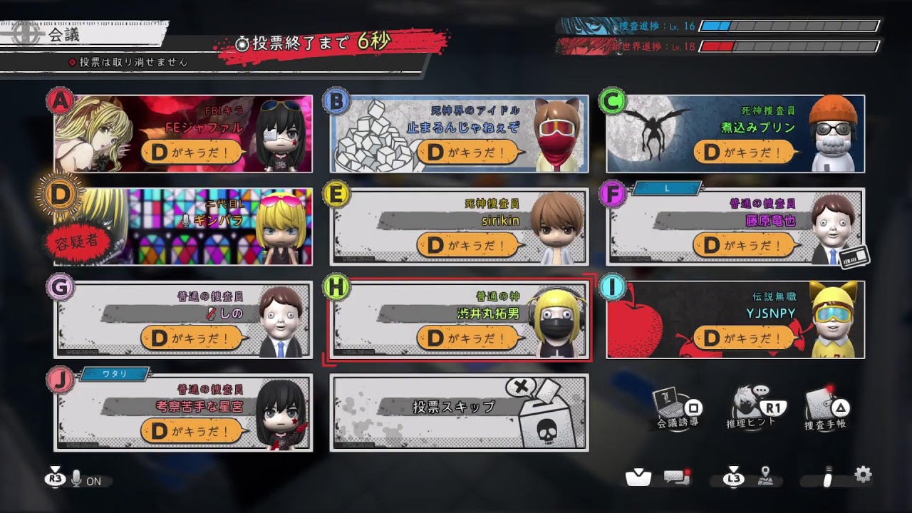えっと、ジャニさんとジャラプターさんでディスプラプターさんか。よろしくお願いします。 よろしくお願いします。 よろしくお願いします。 ディスラプターさん大とジャニクさん喋れますか? あれ?抜けたな。 ちょっとじゃあしようか。ニクさん大丈夫すか? 感染者の2人が入ってくるか。お お、入ってきた。 はい。 えっと、えっと、名探偵こなさんと名前コロコロ変える人さんかな?あ、すいません。 名前コロコロ変える人さん、よろしくお願いします。あ、ありがとうございます。い や、お願いします。いや、簡単な。はい、 よろしくお願いします。ルール説明します 。えっと、キラ陣営に関しまして、まず 進捗倍率が1.2、え、LG陣は1.3と なっております。で、キラ陣営に関しまし て聞き込みタスクのダミータスクあり、 微分症の所得の切り替えのオンオフ機能 ありで微分所得時間の倍率が0.6倍なの で普段より早く取れます。 で、え、LG陣営なんですけど、全員 デスノート開くことないので気をつけて ください。で、総作員の接近警告の表情を オフにしてますので、近づかれた際は自分 でメモするように心がけてください。で、 役職に関しましてキラ信者は、えっと、 確定で、で、一応信者か大弁者かは ランダムに設定なっております。で、メロ あたりは確定でちょっと局調だけランダム となっております。で、あとキラキラ陣 最後の犯罪者のノートに書くに関して犯罪 者は1位、捜作員が2コマンドで一応 ノートにかけるようになっております。で 、メロに関しましては、ま、一応初日打ち はオッケーなんですけど、ちょっとある 程度予測うちにお願いします。あの、最初 に隣だからって打つのだけはやめて ください。あ、他になんか質問などあり ますか? 僕らは特には。はい。 ありがとうございます。他は キラ信者の種類がランダムってなってるとこれキラ信者がいるかどうかもランダムになるんですかね。 あ、それはそれそれはならないです。キラ信者は絶対 1人でいます。 あ、 だからキラとキラ信者で信者かあの大面者のどちらかって感じですね。あ あ、なるほど。分かりました。 他は大丈夫ですか? 大便車引きればラッキー。 そうですね。ここじゃあ始めさ始めていこうかな。 じゃあ、よろしくお願いします。 よろしくお願いします。 よろしくお願いします。 お願いします。 よろしくです。 よろしくお願いします。 僕か優先で対応してください。今書類守ってんだよな。 一緒にエルタスクやりに行きますか? オッケーす。ちょっと書類だけ守ってもいいすか? あ、もちろんですよ。 あと半分ぐらいあるんすよね。 分かりました。 ね。あ、何を? エルタスクをやりに。あ、オッケーす。終わりました。 オッケーす。行きますか?こっち、こっちじゃないのか?こっちかな? よし。 これでキラの台本一歩近づきましたね。 そうっすね。あ、ここか。よし。え、ホテルか。あれ? 本当か?声 協力してください。 おえ。 でかいぞ、これ。あ、こちな んだ今の? これで終わりました。 ちょうどマシンあります。 監視の人が1人来ないと。 はい。 一緒にやりましょう。 よろしくお願いします。 よろしくお願いします。 ありがとうございます。 ありがとうございました。 残り2つと間に合えばいいかが オッケーすね。 まあ、まあ、取られてなければオッケーなんだけど。 よかった。 怖いっすね。マジで マジで怖い。 あ、ここ全部やって。 あ、い。ああ、ある、ある、ある、あるわ。ある、ある、ある。よかった。 そうだ。 あ、よかった。じゃあただのお互いか。これも取られて。 いや、これ20 か。結構進むな。頑張んないと。 一応 この桜TV黒いノート開幕20秒です。 開幕20秒早いな。 で、 開幕ってことはあそこに近い人がま、怪しいんね。 ですね。多分22秒とかだと思います。 おお。はい。あ、でも僕A さんと交板ら辺いたんすけど開いてなかったんであれかな。 そうな。なんかお互いに交板に入ってるのも見かけてすごい怪しいんでてチェース始まってましたからね。 なるほど。 なぜ知りなやろか。 はい。えっと デスノード中。 デスノー途中はGとC さんと自分であのマップの右側あれどこなんだろうな。 え、会議会議室か。 会議室か。会議室のやつやってて、自分が監視してて、 GとC さんがやっててくれたって感じで誰も近づかなかったすね、そん時は。 あ、なるほど。 で、トイレはAHでD監視でしたか? はい。そうです。 えっと、自分らはゼミナーでやってて、 IとJがゼミナーでやってました。 IとJがゼミ。 はい。あってます。あ、です。 あと追われるとしたらあれか、総のタスク中止められたじゃないですか。あの時誰か見える人ました? 実はいな。 空は特には 特にない。 BFJだったっけな。 Eはいないで。FJ テレビ曲前に集まる。 Hも私見れた気がしますね。 Hもいましたか? あ、いや、あのカフェ本屋あたりでそん時にました。 あ、行ったっすね。 確かに本屋に確かにま、終わった止められ