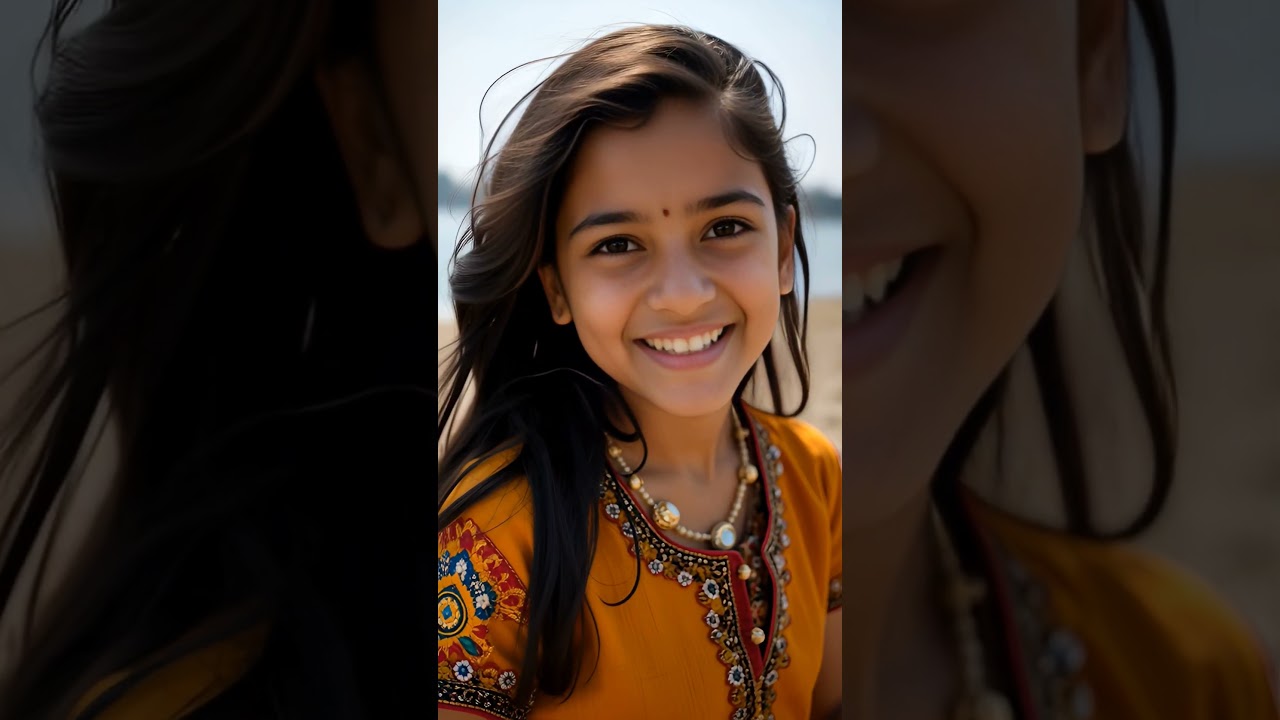 Close-up portrait of a young Indian woman, her radiant smile and serene eyes reflecting inner peace; soft, diffused sunlight warms her flawless skin as a gentle sea breeze tousles her dark hair, a stylish bikini strap hinting at the nearby beach and capturing a moment of confident, sun-kissed bliss