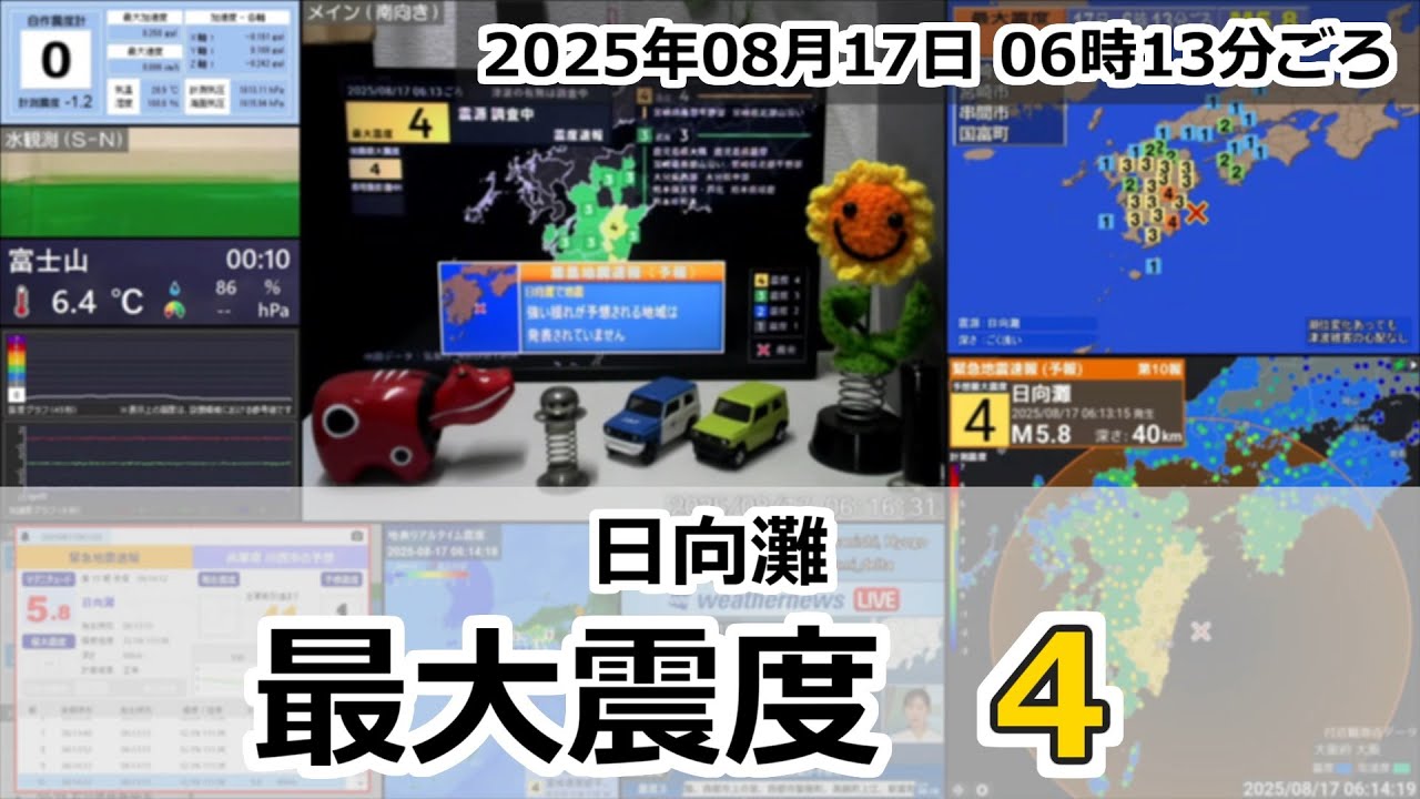[緊急地震速報] 2025年08月17日 06時13分頃 最大震度4 / 日向灘 M5.8 ごく浅い