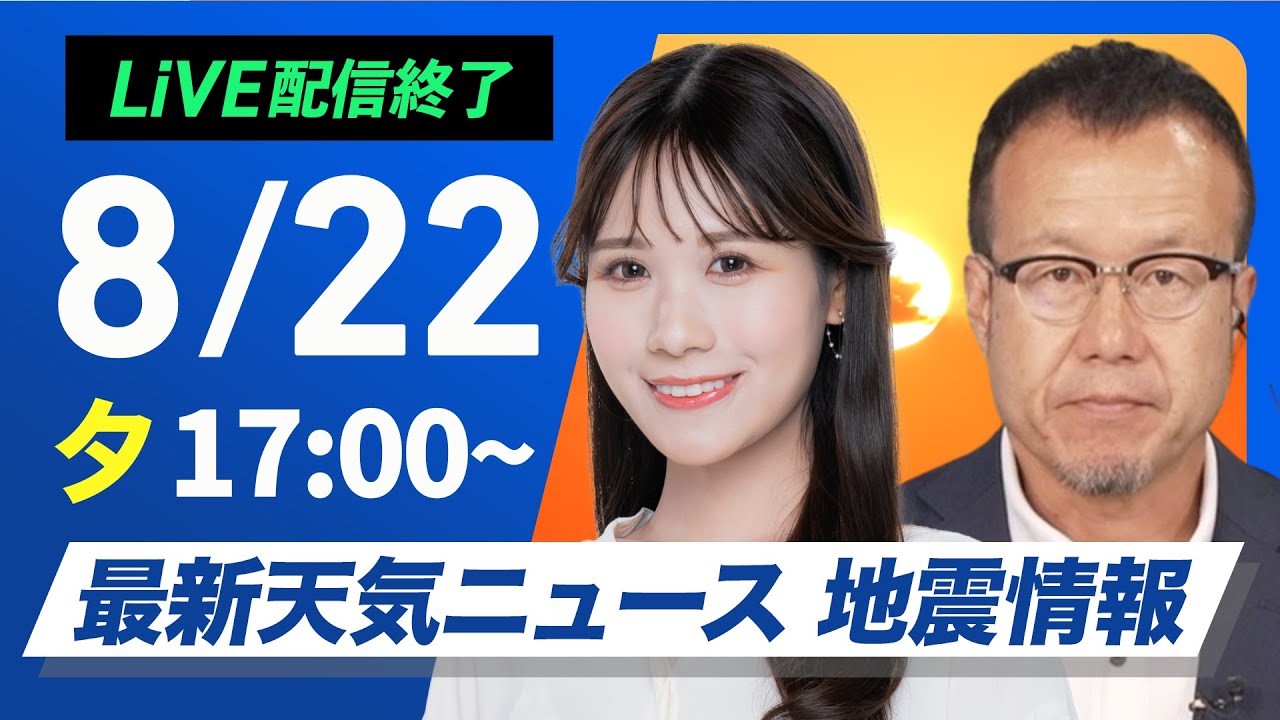 【ライブ配信終了】最新天気ニュース・地震情報 2025年8月22日(金)/台風12号は熱帯低気圧に 引き続き九州は強雨に注意〈ウェザーニュースLiVEイブニング・戸北 美月/内藤 邦裕〉