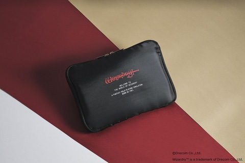 本書は、RPGシリーズ「ウィザードリィ」初のアイテム付きBOOK。お馴染みの赤いロゴと、スタート画面を彷彿とさせる文字デザインをあしらったポーチが付いている。クッション性のあるポーチは、ステーショナリーやガジェット収納などにもぴったりで、内ポケットも付いている。サイズは約23.5×16×2cm(幅×高さ×奥行)。