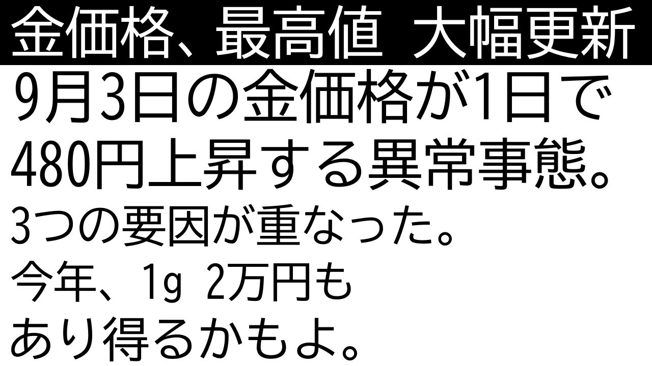 こんにちは。正です。円立て金価格が 1万8691円 と480円上昇しました。最高値更新です 。2万円が近づいてきました。2万円は 来年だろうと思っていたんですけど、 まさかのまさか今年ですかね。本当 びっくりです。早すぎます。ゴル建て金 価格も最高値更新です。3538ドル です。何が起きたかと言うと、1つは 利下げ観測が強まったからです。昨日は アメリカでISM製造業指数が発表された んですけど、予想より悪かったんです。 これで景気大丈夫ってなって、今月の 利下げを92% 折り込みました。9月17日です。そして 2つ目なんですけど、英国の長期国債が 売られてるんです。つまり利回りが急上昇 してるんです。27年ぶりの数準だそう です。今更ですかっていう感じなんです けど。インフレを折り込んだんじゃないか なと思います。567月とどんどん上がっ てるんです。アメリカも同じなんです。 567月と物価が上がってるんです。 ISM製造業気指数が悪いんだけど物価は 上がってるとあれスタグフレーション じゃんていう話になってくるんです。それ で英国の長期国際に釣られて米国の長期 国際まで売られちゃってるんです。利回り が急上昇しちゃってるんです。こういう 状況だったら通常はドル安、つまりドルが 売られるんですけど、今回はドル高になっ てます。なぜでしょうかね、分かりません 。夜高になるとゴールドは下がりやすいん ですけど、今回は最高値になってます。 まとめるとこうなります。景気が悪くなっ てるんだけど物価も上がってると。パウリ 議長は利下げはしたくないんだけど、 トランプ大統領がうるさいから利下げを するしかないとそう思っているはずです。 政治の介入によって金融政策が歪んじゃう とリサクック理事を首にしてリサゲを推進 する新しい理事を入れるとこういうことを やってしまうと金融政策が歪んじゃうん です。その結果インフレになっちゃうかも しれません。こういうリスクも折り込んで 金価格が最高値更新したわけです。兵器が 悪い、物価が高い、中央銀行の独立性が やばい、こういうリスクを折り込んだわけ です。ドル高でも関係なく最高値更新です 。もうね、2万円行っても驚きません。で は以上です。ご視聴ありがとうございまし た。