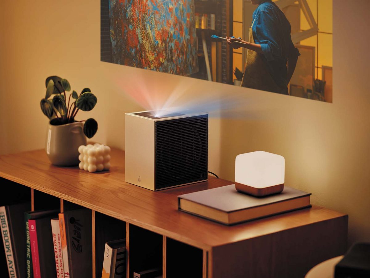 Google TV搭載プロジェクターでは世界最小(※)を誇る。超コンパクトながら、明るさの均一性が高く、暗くなりがちな画面の隅まで鮮やかで繊細な映像を映し出せる。各種自動補正機能備え、好きな場所から投影が可能。