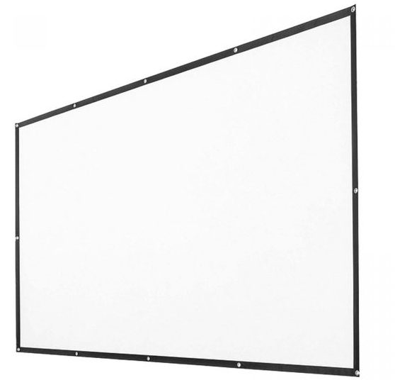 スタンド不要で壁に貼り付けて使用できる100インチの大型スクリーン。シート状で、フックなどに掛けられるハトメを備えており、使用しないときは巻いて収納できる。