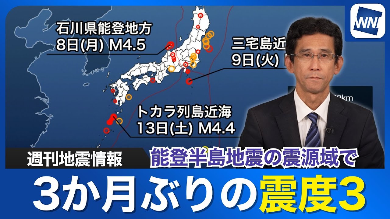 え、1週間の地震についてお伝えする週間 地震情報です。え、まずこちらの図をご覧 ください。こちらが14日午前10時まで の1週間に発生しました震度1以上の地震 のをプロっとしたものになります。え、 この1週間ですけれども震度3以上の地震 は2回発生をしております。で、その中の 1つ、まずこちらですね。石川県の地方を 進地震です。え、8日月曜日の朝に発生を しました。え、この地震で元半島和島とで 震度3の揺れを観測しています。この半島 と言いますと、え、去年1月1日に発生を しました、え、半島地震、ま、その余心が 今も続いてるということになります。え、 この野島地震の、ま、余心域で発生した 地震で震度3以上の揺れを観測するのは、 え、今年5月31日以来3ヶ月ぶりのこと と、え、なります。ま、こう比較的こう間 を開いて、ま、起きてきたわけなんです けども、ま、最初の地震が大変大きな地震 でした。去年1月の地震が大変大きなもの でしたので、まだまだ地震活動は活発な 状態が続いています。ま、今後も震度3 あるいは4程度の、ま、揺れを伴う地震と いうのは、ま、いつ起きてもおかしくは ないといった状況ですので、ま、しばらく は強にまだ注意が必要となりそうです。 そしてもう1つがこちらです。これは震度 3以上の地震ではありませんけれども、9 日火曜日の夜に発生をしました宮明島近海 の地震となります。え、マグニチュードが 4.3、神経の深さが17kmとなってい ます。え、この地震で三宅、三宅村で震度 2です。え、その他国津島村や八条町など で震度1の揺れを観測したといった状況に なります。で、この、ま、三宅近海です けれども、この日、ま、この翌日ですね、 この日翌日の10日早朝にも マグニチュード3.7の、ま、地震があり ました。ま、それとは別に9日火曜日の 夕方には伊島の、え、近海でも2回の体に 感じる地震が起きています。で、伊豆諸島 近会の地震というのは地下のマグマの活動 に関連して起きると、え、いった場合が あるんですけども、ま、10日の日中以降 、ま、地震活動は各地落ち着いてる状況 ですので、ま、現時点で何か火山活動に、 ま、直結するなどのそういった心配はない かと見られます。そして最後に海外の地震 です。え、USGS8、ええ、USGS アメリカ地質調査書が決定した、え、 マグニチュード4.5以上の地震の信源を ポロットしたものになります。え、この1 週間ですけれども、最も大きかったのは 日本時間の、え、13日昼前に起きた マグニチュード7.4の地震です。これは カム茶塚半島の、あ、当近で起きた地震と なります。で、この地震かなり大きな地震 でしたけれども、こちら7月30日にです ね、このカム茶半島の、え、東の沖き合い でマグニチュード8.8という、ま、超 巨大地震が発生しました。で、その余心 活動が今も続いている状況でして、これが 、ま、13日の大きな地震につがったと いうことになります。地震活動は非常に 活発な状況なんですけども、日本付近です とその超巨大地震、あの2011年の東北 地方太平地震というのがありましたけれど も、そのマグニシュード9.0の、ま、 地震の、ま、余心活動というのはその数年 にわたって非常に活発でした。 マグニチュード7クラスの地震も2011 年の地震の後何回も起きたわけなんです けども、このカムチ塚半島機の地震も 2011年の地震に匹匹敵するレベルと なっています。まだ数年にわたって大変 大きな、ま、余心なマグニチュード6 クラス7クラスが起きてもおかしくはない といった状況です。ま、日本に比較的近い 場所でもあります。大きな地震が起きた 場合は津波の、ま、恐れという話もあり ますので、ま、日本からも海外の、ま、 地震であるんですけども、貨物半島の地震 についても、ま、要注意といったことは 言えそうです。 え、最新の国内の地震情報ですと海外の 地震に関するニュースについてはお天気 アプリウェザーニュースでもご覧いただき ます。