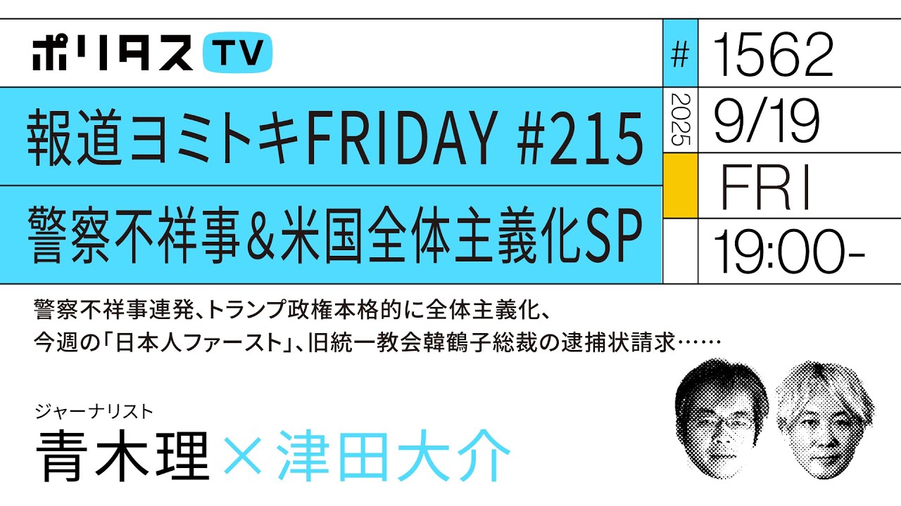 報道ヨミトキFRIDAY #215|警察不祥事&米国全体主義化SP|警察不祥事連発、トランプ政権本格的に全体主義化、今週の「日本人ファースト」、旧統一教会韓鶴子総裁の逮捕状請求……|青木理(9/19)