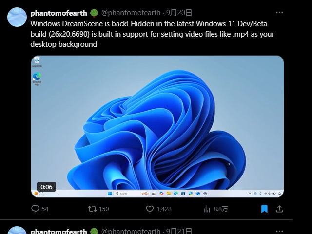 プレビュー版「Windows 11」で多くの隠し機能を発掘している @phantomofearth 氏が、また未公表の新しい機能を発見したようです。どうやらデスクトップ壁紙に動画ファイルを指定できるようになるとのこと。