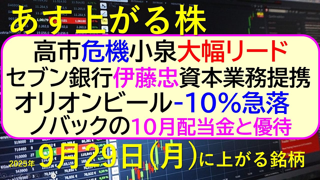 あす上がる株 2025年9月29日(月)に上がる銘柄。高市危機、小泉大幅リード。セブン銀行伊藤忠、資本業務提携。オリオンビール10%急落。ノバック配当~最新の日本株情報。高配当株の株価やデイトレ情報~