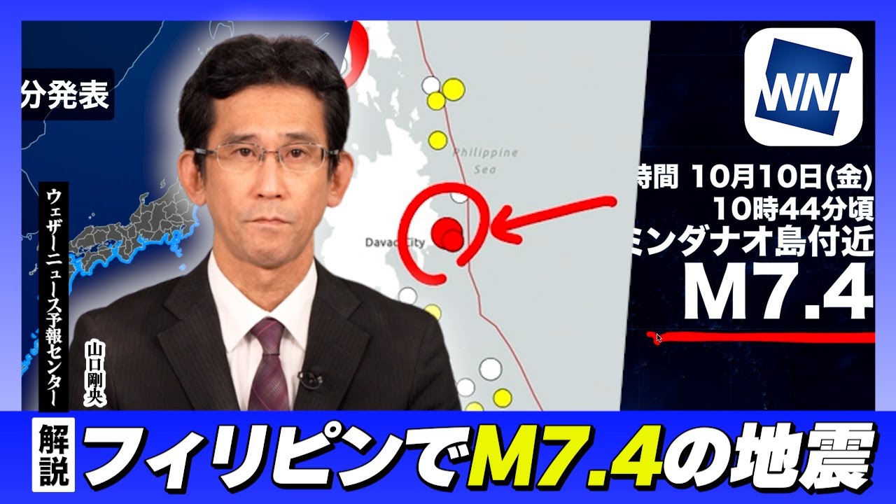 え、日本時間の午前10時44分頃です けれども、海外で規模の大きな地震があり ました。え、新源の位置をご覧ください。 え、信源はフィリピンの民ダオ東付金と なります。え、マグニチュードが7.4と 、え、かなり規模の大きな地震です。で、 この、ま、地震によって、ま、日本の気象 庁によりますと、日本の沿岸においては ご覧の通り北海道から、ま、九州の太平 洋側伊豆小笠原初島、南世諸島について 若干の海面変動の可能性はありますが、 被害の心配はないといった情報を11時 16分に発表しております。え、この若干 の海面変動情報というのは高さ20cm 未満の海面の変化が、ま、予想されるん ですけども、ま、それによる被害の心配は ないといった情報です。ま、特に避難行動 などを取る心配必要はありません。一方 このフィリピン民ダ等付近源に近いところ に関しては、え、日本の気象によりますと 、ま、津波の可能性があるといったことに なります。で、このフィリピンの近くです が、この最近起きた、1ヶ月に起きた、ま 、地震の信源なんですけども、この赤く 表現してるのが今回の地震です。陸地に かなり近いところで起きました。現地では 揺れがまず強かったものと見られます。 被害の発生が心配される状況です。一方、 フィリピンですと4時間6月30日の、え 、深夜にセブ島付近でマグニチュード 6.9の地震がありました。これが内陸性 の、ま、実信となってかなり被害を及ぼし たんですけども、え、今回はもう一回り 大きなマグニチュード7.4の地震です。 タイプとしては、ま、違うものと見られ ます。今回起きた7.4の地震はここに ありますのが、こちらのフィリピン海 プレートと大陸のユラシアプレートのこの 間に当たる部分です。ではプレート協会に あたるところでして、ま、今回はプレート 協会にかなり近いところで起きた、ま、 教会型自身の可能性があります。ま、性格 はですね、あの置き方は、ま、違うんです けれども、ま、短期間の間に立て続けに 強いに見舞われたフィリピンということに なります。え、国内の最新の地震情報です とか、海外の地震に関するニュースについ てはお天気アプリ、ウェザーニュースでも ご覧いただきます。