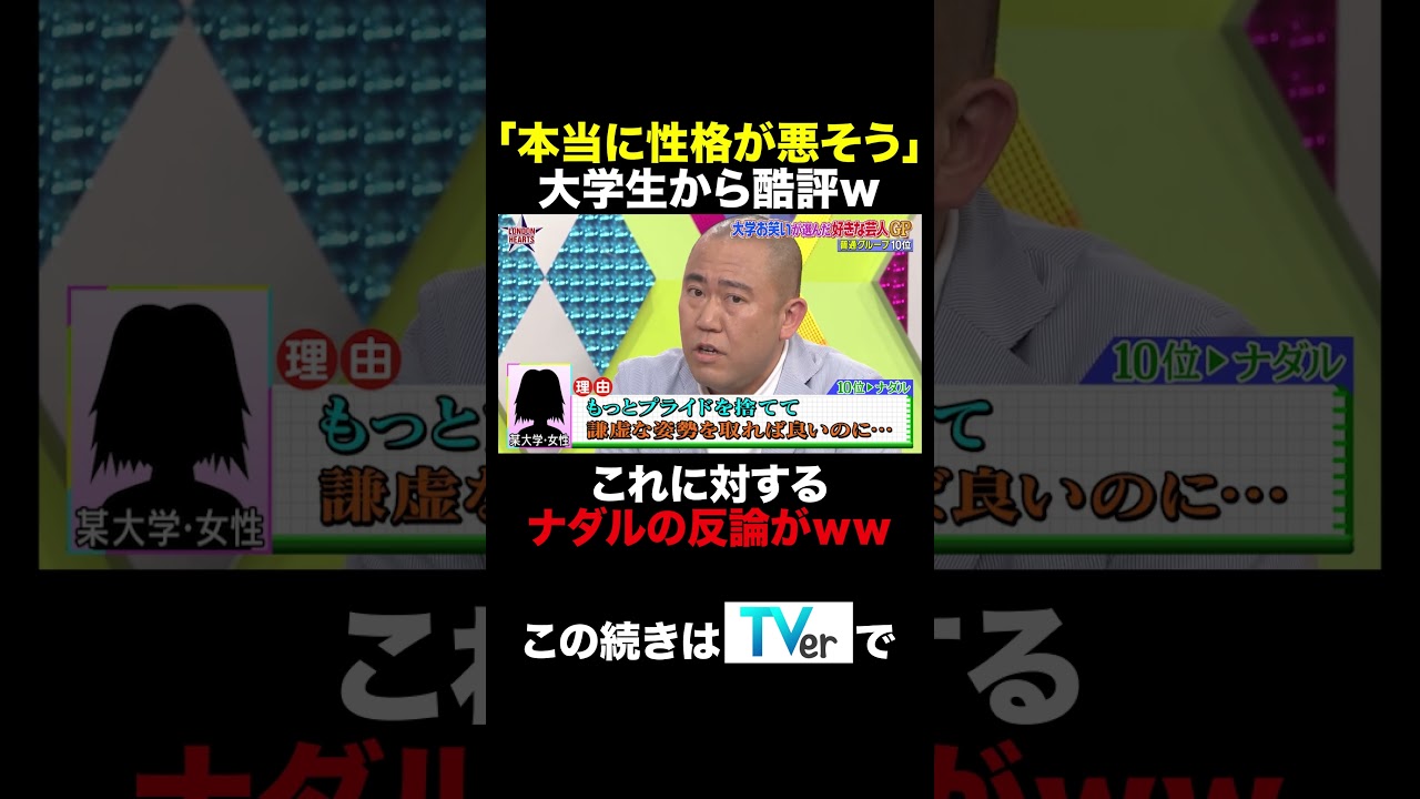無料見逃し配信中‼️📺 https://tver.jp/episodes/epjm624h2od?utm_source=youtube.com&utm_medium=referral&utm_campaign=ex_londonhearts_0610「本当に性格が悪そう…」 大学生から酷評を受けるナダル😨「素人やもん」と強気の反論も、実際はダメージ大でダウン寸前🥊⁉️ #お笑い #バラエティ #ロンハー 尾崎ナナ
