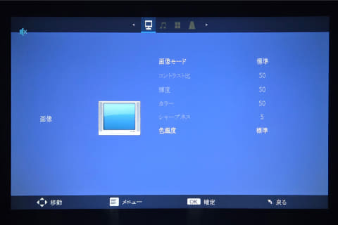 調整機能も、価格を考えれば意外なほど充実している。画像モードは「標準/ダイナミック/マイルド/ユーザー」を用意。ユーザー設定ではコントラストや輝度、カラー、シャープネスの調整が可能。色温度は「寒色/標準/暖色」から選択できるが、これは標準以外にするとサイケな色になるので触らない方が良い。