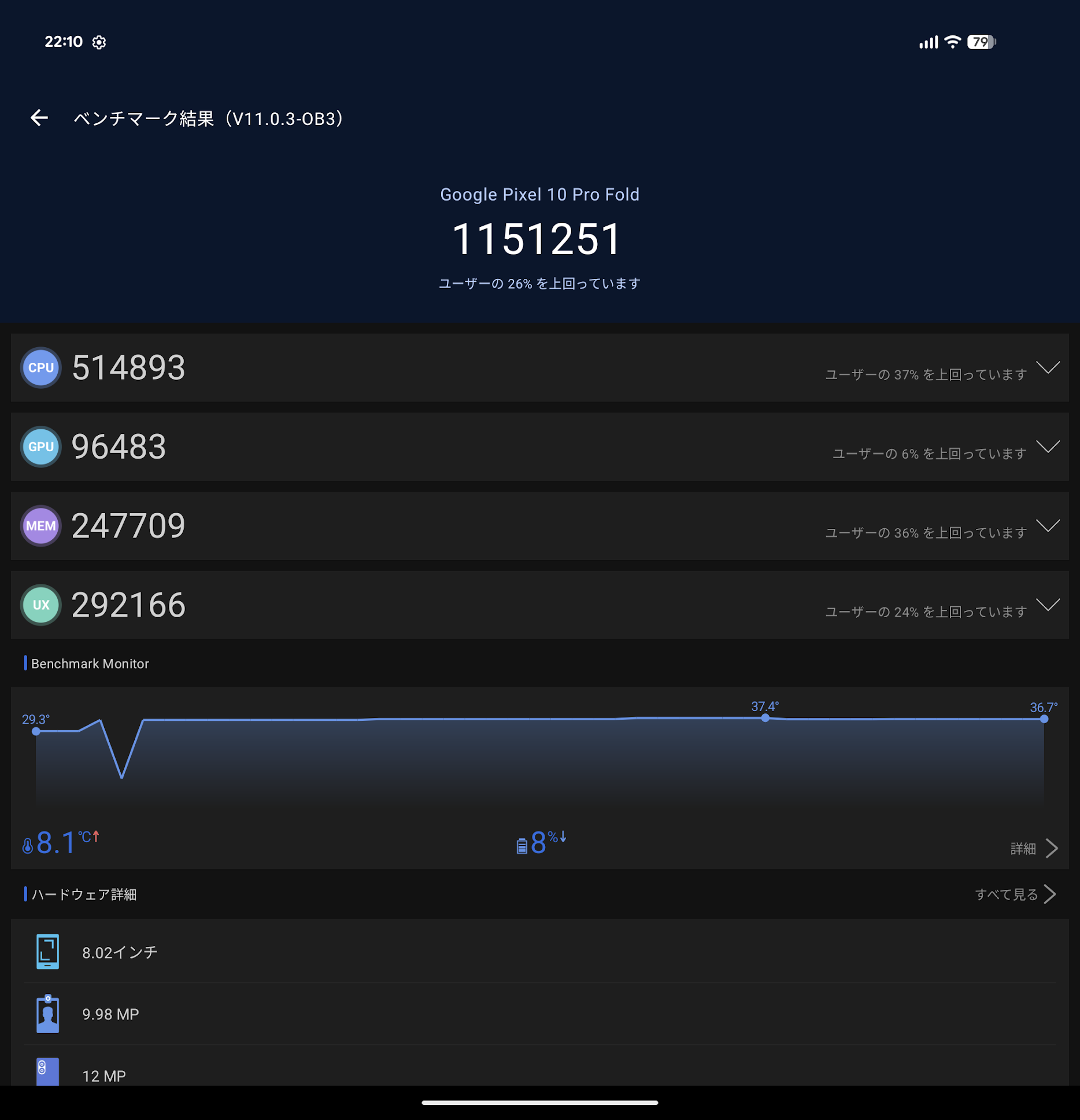 取り急ぎAntutuベンチマークを実行しました。スコアは110万台と、26万超のスマートフォンとは思えないスコアの低さでした。
