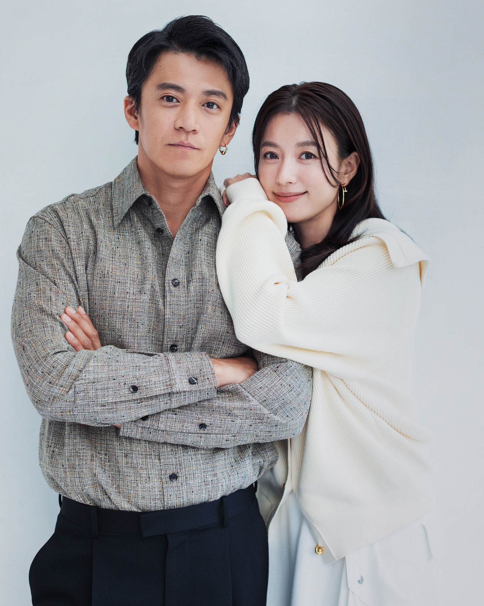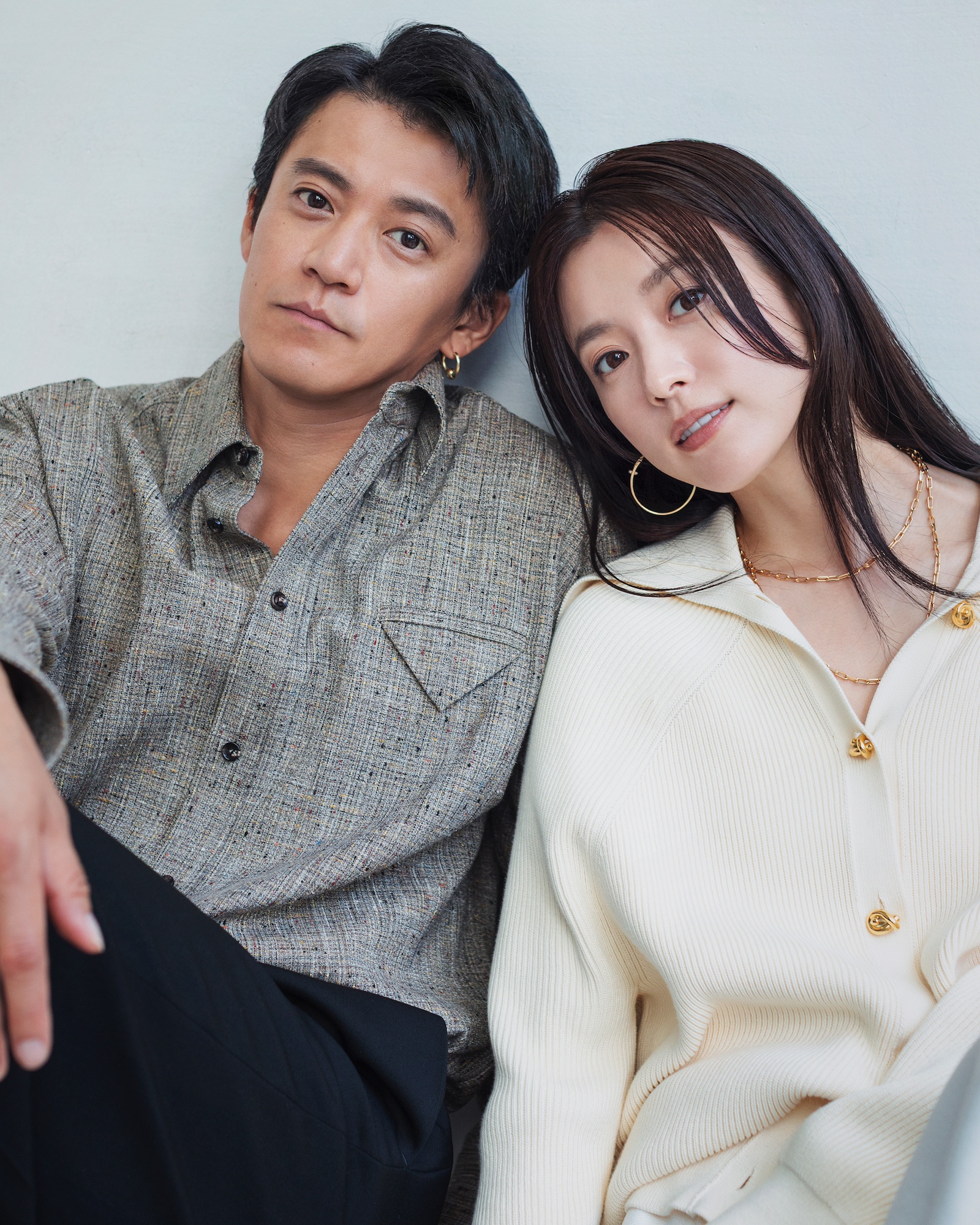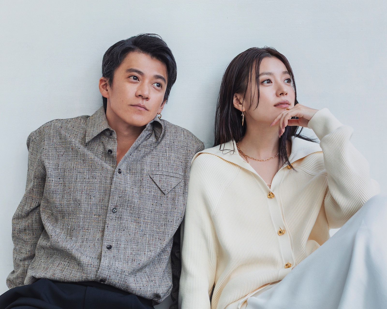 [SHUN OGURI]] シャツ 23万9800円、パンツ 17万3800円、シューズ 参考商品/全てボッテガ・ヴェネタ(ボッテガ・ヴェネタ ジャパン︎0120-60-1966)、[HAN HYO-JOO] トップス 33万円、スカート 40万400円、靴 26万4000/全てボッテガ・ヴェネタ(ボッテガ・ヴェネタ ジャパン 0120-60-1966)、ネックレス 147万8400円、イヤリング 134万6400、左人差し指リング 76万4500円、右中指リング 77万5500円/全てカルティエ(カルティエ カスタマーサービスセンター 0120 1847-00)
