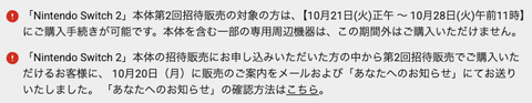 任天堂は10月20日、通販サイト「マイニンテンドーストア」における第2回「Nintendo Switch 2」招待販売の対象者に向けて、案内メールを配信した。