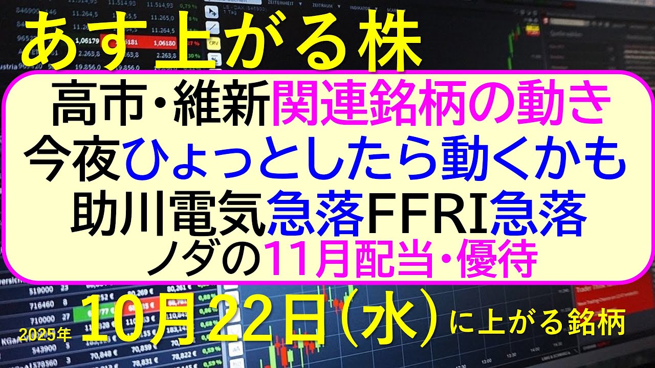 あす上がる株 2025年10月22日(水)に上がる銘柄。高市・維新関連銘柄の動き。今夜ひょっとしたら動くかも。NTTの買い時。ノダの11月配当・優待~最新の日本株情報。高配当株の株価やデイトレ情報~