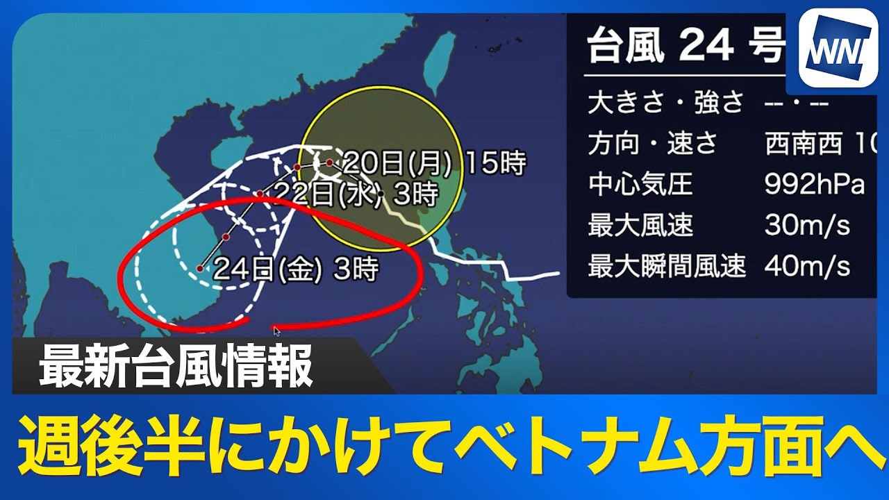 台風24号シは南海にあって、この後 ベノナムへ進む予想です。え、日本につい て直接の影響というのはない見込みです。 え、現在の、え、状況確認をしてみますと 、え、台風245分線ご覧のように中心 気圧は、え、1000hパカ最大風速 20mということになっております。え、 現在の 衛星画像の様子、え、確認をしてみますと 、え、南しに入った雲の塊と、え、いうの が確認できる状況です。え、この台風です が、え、今後の進路の予想を見ていただき ますと、南中へを進んで、え、今週後半に かけてベトナム方面へ進んでいくだろうと 、え、いう予想になっております。日本へ 近づくことはない見込みで、え、またこの 後の、え、波の予想見てみましても 波の高まり南海外が中心ということになり そう。南世ショ頭方面今週の半ば少し波 高くなりますが、え、こちらは台風の影響 というよりも、え、北寄りの季節風による 影響の方がはっきり現れるということに なりそうです。 え、台風の最新の状況はウェザーニュース アプリなどで確認いただけます。