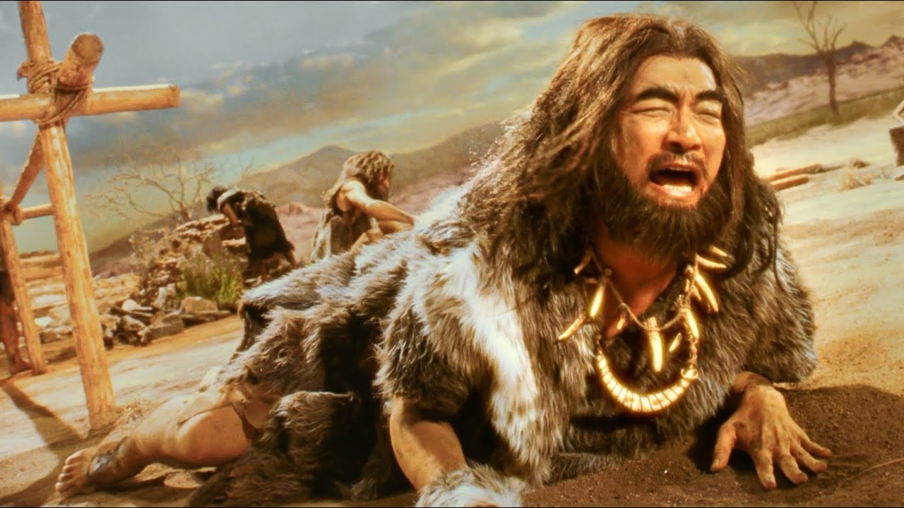 原始時代の建築現場での出来事。スタッフが「親方、何ですかこの柱!?」と、一人親方(香取慎吾さん)に詰め寄る。一人親方は「木材買うお金なくてさ」と軽快に答えますが、そこにあったのは山で拾ってきたというマンモスの牙。