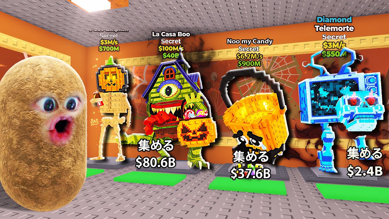 皆さん、今日はブレインロットを盗む Robloxにスポーキーアプデがあった んですけど、 もうマジで過去最高に面白いし、とんでも ないブレイノート大量に追加されてたので 、是非最後までお見逃しなく。ちなみに 究極合体勉強とかも出ちゃいましたか。 あともう少しでチャンネル登録者数 200 万人なのでチャンネル登録してくれた方には漏れなく全員芋ラキブロック。おあほ。スポーキー。ラッキーブロック。ラッキーブロック。ぐいで。お前ついてきます。 皆さん今回スーキー怖い怖いアプリ第2弾 というわけで、このスプーキーラッキー ブロックが追加されるっぽいんだけどお前 見てこの綺麗な顔見てこいつもちしたもち じゃあもうまだアップデなんだ けどスプキーラッキーブロック1発目カボ 皆様が今高評価とチャンネル登録をして くれたおかげで1番レアなキャラ出てき ます。 武器ラキブロックモン。あーお。何これ?カップチーノ。クラオーノ。お、 カップチーノ。あ、え、なんだっけ?カップチーノアサーノのスポーキーバージョンだ。怖い怖いバージョン。素晴らしいだ。皆様のおかげですの刀流コーンヘッド。 この前ね、タコスイベントで限定の見て これチプソアンロヘイソっていう シークレットも手に入れちゃいました。 素晴らしいことです。本当にこいつら見 たいだ。ああ、もうちょ楽しみすぎるんだ けど。俺ハロウィン大好きだから。本当に お前誰も欲しくないねん、マジで。 スポーキー アップデ開始 しました。多分。おま、見てこえはえ、穴 開いてんだけど墓場みたいになってる。あ 、落ち、落ちれないわ。誰が死んだん でしょう?何これ?スプキーラッキー ブロック再生ってなんだけど。あ、交換 するってこと。アめちゃんを。そういう ことか。トリコはトリートだからアめ ちゃんを上げるとこれがもらえるのかな。 で見てブルパターピー死んでんだけど皆 さん 高評価 ブルパ死んだブルパターピームを手持ちに 入れました。パターピームの墓だったんだ 。何これ? なんか、え、掘れるってこと?あ、掘れる 。 しかもなんか12体お見て。ピレビされた 。 おほ。ほりほり。ボーい。あ、 なるほど。穴をホリホリすることによって アめちゃんが手に入ると。ほん。うわ、 すごいな。マジでこのマップすごすぎやろ 。かぼちゃとかもあるし。ジェット コースターに乗れるって言ってたんだけど どこやんだジェット なんだこれ?お前え乗れる?乗らして俺 乗りたいんだけどやった。あ、来た来た。 ああ 。 え、1%のチャンスでノーマイキャンって やつが一緒に乗ってくれるらしいよ。 ジェットコースだ。おえ。楽しい楽しい。 早くね。もう1回もなんか乗ってれば出て くるってこと。うわ、マジかよ。ジェット コースターでシークレットも出るし。あと 穴ホリホリあちゃう。お墓ホリホリしても シークレットが出るんだって。俺皆さん ジェットコースター大好きなんですよ。 ジェットコースター大好きな方、高評価と チャンネル登録マジで。そしたらうんち出 ます。高評価してると。あ、あ、ちゃう、 間違えた。ちょっと待って。ジェット コースター乗ってる場合じゃないんだけど 。お前ちょっと待って待って待って。 ジェットコースター乗ってるせいで スプキーラッキーブロック逃す。ノノノ。 ラキブ。危ぶねえ。時間ないから。 ホリホリ。皆さん見てこのあのシャベルが あの喋る男がついに役立つ時は来たと。 じゃ、ちょ、ドエンド乗らしとこう。あめちゃん掘るぞ。やること多いな。忙しいよ、今回。ちょっとサイコラップでだろ、これ。うん。ハロウィンみんな大好きだから。穴掘りホりしたいと。マジで。ハロウィンで。で、キャンディが何個でこれ? 500個。あ、500 個。アめちゃん必要なの?やばくね?あ、ちょっと待って。あ、うわ、マジかよ。家でトリクアトリートもできんの?これ。トリックアトリートできる。 誰が出てくんの?これいたずらしちゃうぞ 。お前すごい顔面のやつ来た。よせ、お前 。あ、もうもらったの?すごい顔面の人が くれた。うわあ。やっぱ皆さんハロウィン といえばね、これ人の家に行ってピンポン ダッシュすると違いますよ。皆さん ピンポンダッシュしちゃだめよ。え、 掘りホりタイム終わっちゃった。 お、なんだこいつ。キックされたんで蹴 られたんだけど。なんだ今のやべえやつ いるぞマジで。いや、おもろすぎるって。 このアプデ。あ、てる。お前、こいつ蹴っ て遅れた。 なんでさっき蹴ってきたの?俺のこと?お前見て。スポーキーパイドニーだって。これこれさだって。あ、パンプキーニスパイドリーニーだって。お、 ポンプキーニスパイドリーニー。 ポンポンポうんポ。このシャベルがやっときてくれたらね、本当にね。嬉しいね。カモン。ホリホリタイムおもろよし。 スカウスカウ。 え、何こいつ?え、こいつ隠れキャラじゃね?ホリホリして出る。スカル、スカル、スカルだって。 で、12体新キャラ全部集めるとこの スポーキー基地