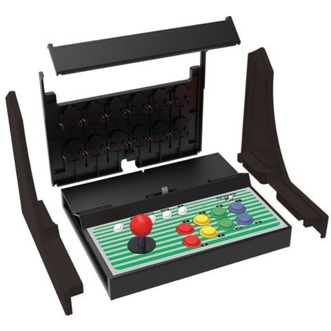 本製品は、工具不要で簡単に組み立てられるアーケード筐体型コントローラ。Switch2本体やSwitch本体を組み込むことで、ゲームセンターにあるアーケード筐体のような外観に仕上がる。組み込んだ本体は本製品のコントロールパネルで操作が可能だ。ゲームのプレイはもちろん、各種操作を行なえる。また、便利な機能として任意のボタンを連射にできる「連射機能」や、本製品背面にゲームカード、microSDカードを各12枚収納できる収納スペースも搭載されている。