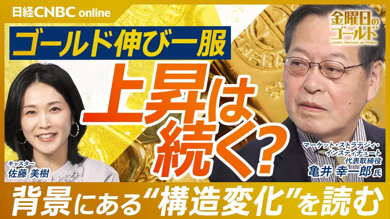[音楽] この番組はステイトストリート インベストメントマネジメントの提供でお 送りします。 こんにちは。 今週も始まりました。金曜日のゴールド キャスターの佐藤きです。近年安全資産と して注目を集めている金、ゴールドへの 投資にスポットを当てて様々な視点から その戦略的な価値を探ります。ゲストをご 紹介しましょう。 マーケットストラテジインスティチュート 代表取締まり役金融危金属アナリストの 亀井孝一郎さんです。よろしくお願いし ます。よろしくお願いします。 ではまず年所からの金の価格の水見てみましょう。 はい。 最高値をつけてから今週大きく下げました。 はい。 亀井さん、この動きどうご覧になりましたか? そうですね、これ、ま、あの、先週の動きなんですけど、直近でアメリカの地方銀行がですね、 2 個有資に絡むちょっとこう問題があったという話が伝えられた時にでね、え、このわゆる信用連鎖って言うんですけど、いやもしかしたらそういうその危機的な動きがあるんじゃないかということで禁止場で短期筋が一気に回を増やしたんですよね。 これが先物市場とか、ま、金のETF もありましたけども、 それがですね、ところが、ま、それはもうそれの一家税の話であって、そんなに広がりはないんだよって分かった時からですね、一気に逆に うん、 利益確定の売りが出始めまして、それが売りを売りを呼ぶというような形で急落したということではっきり言ってこの禁止の取り巻く環境はあまり変わってないんですよね。え、従がって、ま、あの、相番を落ち着くと思います。はい。 はい。 では、ここからはテーマに沿ってたっぷりと亀井さんの話伺ってまいります。 金曜日のゴールド。今回のテーマはこちらです。米国金利とゴールド逆総感の今ということで一般的に長期金利が上昇しますとゴールドから資金流出が起きて価格が下がる。 はい。 いわゆる逆層感のこの関係があるという風に言われていますが はい。 近年そうした関係が崩れているそうですね。 そうなんですね。 元々金は利息を見ませんので、まあ、金利、アメリカの金利等はですね、利の動きをするということなんですけども、これのようにですね、ちょうどその、ま、この、こういったこの逆の動きが見られますが、 ちょうどその2024年ですね、このその 金利も上がるし金も同時に上がるなんていうことが起きてきたわけですよね。 ま、これがそのこれまでないその、ま、シナリオの中のその、ま、逆發戦が崩れたんじゃないかという話なんですけども、 どういった要因があるんですか? そうですね。 一言で言うと、その金用の構造が変わってきたっていうことは言えると思うんですけど、もし大きいのは 新国の主銀行の会ってのが、ま、近年間にこの指摘されてるわけですけども、やっぱり中央銀行っていうのはそういう金利水準の云々と関係なくて、その外貨準備のポート不料の比率を変えるっていう話になるんですよね。 え、それとその元々その新興国の個人、 特にインドですか中国とかその公配力を つけて経済成長の中であに金を買い始める んですけども、その人たちはアメリカの 長期金利だとかそういうのあまり関係なく ね、やっぱり私は金を現物欲しいんだ みたいな買いってくるもんですから、あの 、元々その金利を気にして金の売り返し てるのはどちらかというとヘッジファンド だとかプロの投資家が多いんですよね。 ま、そういうそのプロの投資化の影響力っていうのが近年ちょっとやっぱり以前に比べて落ちてきてるですよね。それがそういう風に逆関性が少し崩れた背景になってると思います。 なるほど。そして今こちらのグラフ赤枠で 2 箇所を示していますが、この前半と後半で要因に違いがあるといました。 そうですね。これちょうどあの大きく進してた部分がこうま春とこの夏以降にあるわけですけども春そちらですね。 [音楽] そちらは3000ドル割れから4000、 あ、3500 ドルまで上がったわけですけど、一言で表現して中国の会はい。 うん。 なんですよね。あの、ちょうど 4月2 日にトランプ大統領がアメリカ放の日と消して完税の発表しましてね。 はい。 あの時にま、単なる脅じゃないか本当に完全てきたんだなってことでマーケット騒ぎになって、え、アメリカではベドルも下がる、株も下がる、アメリカ国債も売られるっていうのはいわゆるトリプリアスの状態になってだその時に金がまあ上がり始めるんですけどその時の会能死体になったのが中国税だったんですよ。で、近 ETF のチャート見ていただくとそれがま、明らかなんですけども、 この、 これ地域別に、え、出てるわけです。 これ2月3月4 月なんですけどね。このグランドのピンクの部分っていうのがですね、アジアなんですが、ほぼ中国なんですね。ま、日本も入ってますけど、一部はね。 で、特にその4 月なんてのはもうももうほとんどこれ 100そうですね、15tのうち70t 近くが中国生かかってきたっ