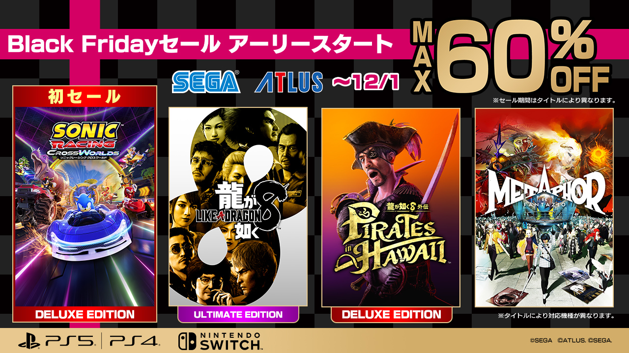 セガは、PlayStation Storeおよびニンテンドーeショップにて「Black Fridayセール アーリースタート」を11月12日より開始した。