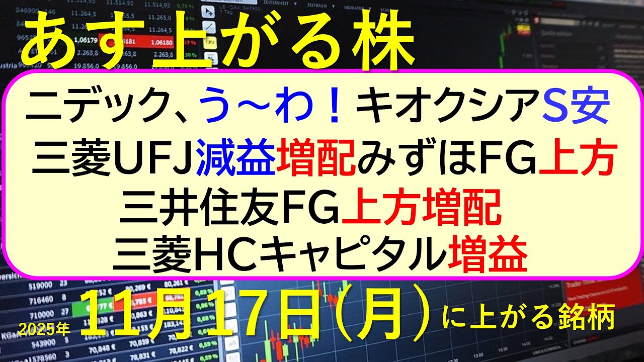 あす上がる株 2025年11月17日(月)に上がる銘柄。ニデック!キオクシア!三菱UFJ減益。増配みずほ上方。三井住友上方増配。三菱HCキャピタル増益~最新の日本株情報。高配当株の株価やデイトレ情報~