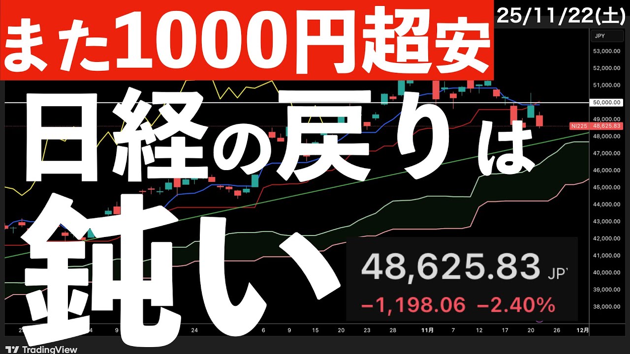 おはようございます。森口でございます。 今日は11月22土曜日の朝でございます が、米株が反発しています。昨日2日経 平均株が1198円 の大幅安になりましたけども、あんまり 戻ってきてないという話をしていきたいな と思っています。どうして反発なのに戻り が鈍いのかっていうところですね。え、 是非最後までお付き合いください。という ことでこのチャンネルでは最新の状況を 取り上げた上でのテクニカル分析を必ず前 優し目標で更新をしております。なるべく 耳で聞いても分かるような形でなるべく 分かりやすい言葉を使って解説を続けて いきます。毎朝7時更新の毎日チャート 分析チャンネル。チャンネル登録を是非 よろしくお願いします。それでは早速昨日 の振り返りを見ていきましょう。まず日経 金株価は1198円2.4%の下落大幅安 となりました。その前の日に1200円 ほど上げていましたからほぼその上昇分を 超消しにしてしまった形になっています。 で、日経金先物が200円前後の上昇と いうことですから、あんまり戻せなかった なというそんな印象ですよね。でも トピックスはそこ型ほとんど横倍券 グロースもわずかにプラスで推移してい ます。昨日のキオドランキングを見て いただきますと、やっぱりアドバンテスト ソフトバンクグループ東京エレクトロン辺 の下落だけでも1000円を大きく超えて いますからね。だからね、上がり銘柄数が 多くてもですね、ま、ここが下げれば 1000円下げることもあるんだなって いう感じがよくわかりますね。業種別 ランキングを見ると比鉄金属機械電気機器 、ま、まさに反動体AI、え、そういう 銘柄が下げているということが分かるかと 思います。アメリカ株チェックしていき ましょう。主要産指数は全て1%を超える 上昇になっていますが、あんまり戻して ない理由の1つとして、ま、ソックスがね 、そんなに戻ってないっていうところが あるんだと思います。で、欧州株高安 まちまちなんですけど、なんかロシアが ポーンと跳ねてたんで、なんか一応上げて みたんですけど、ちょっと材料をしっかり と終えてるわけではないです。業種別 ランキングを見ると全種で上がっているん ですよね。ま、すごいなという風には思う 一方でハイテクが強いとかっていうそんな 感覚ではあんまりないなと思います。ここ にNVDは既に乗ってますけども 1.43%。ここがもう牽引するみたいな 形だったら日経平均株価もグッと上がって いったんでしょうけどそういうわけでは ないんですね。Nスタックの中で指数を検 してるのはGoogleアルファベット ですね。え、3.8%の上昇でAとCある んで、一応実はこうナ作100の中で1番 ね、上がってインパクトがあるのっていう のは今でもGoogleだと思います。 日経金先物がま、200円、300円 ぐらいの上昇ということで4万9000円 回復できればおの字というところでしょう か。で、今日は為せが円高には触れている 感じがしますね。ビックスがまだ20超え てます。ここはよう警戒だと思いますね。 そして10年祭利回りも低下していて、 原油も下がっていますね。で、金先物は 4000円を超えてる、4000ドルを 超えているという形でございます。また 暗号資産のね、下落が止まらない状態です ね。どこまで下がるんでしょうか。 ちょっと心配でございます。それでは見て いきましょう。米株反発なのに前日に 1000円超下げた日経平均の戻りが鈍い ということで話をしていきたいと思います 。まずはいつも通りなんですが、アメリカ 株が始まった後の日経新聞から見ていき ましょう。FRB看発言で12月理下げ 高まるということでした。え、皆さんこの ニュースを読んでどう思いますかね?先日 のFOMCの疑事用紙では多くの議員がね 、12月の利下げはま、しなくてもいいん じゃないかなんていう風に言っていました が、え、たった1人のニューヨーク連金の ウィリアムズ総裁員の金融政策についての 発言、短期的に一段と調整する余地がある 。これは、え、利下げを示唆したという風 に受け止められたんですね。え、それに よって12月リ下げの確率フェドウォッチ では4割弱から7割ほどに上昇した。 めっちゃ変わったなというような印象は ありました。ま、この変化は確かに、え、 アメリカ株価にとってはポジティブなのか なという風には思いましたけども、ま、 もう一方ボストン連金のコリンズ総裁に 関しましては利下げを見送る考えを改めて 示したということです。ま、実際に、ま、 12月のFMCを超えてみないと分から ないところではあるし、雇用統計先日出 ましたけども、それが9月分でしょう。 10月分は見送られ、次は12月の半ば FOMC5に発表されることになり、 CPIもそうだったと思うんですよね。ま 、その中で本当に利下げという決断が できるのかっていうのはちょっと疑問に 残るところかなという風に思いました。で 、今回その影響を与えたニューヨーク連の ウィリアムズ総裁ですね、ていうのは、ま 、常人のメンバーでもあるっていうところ 