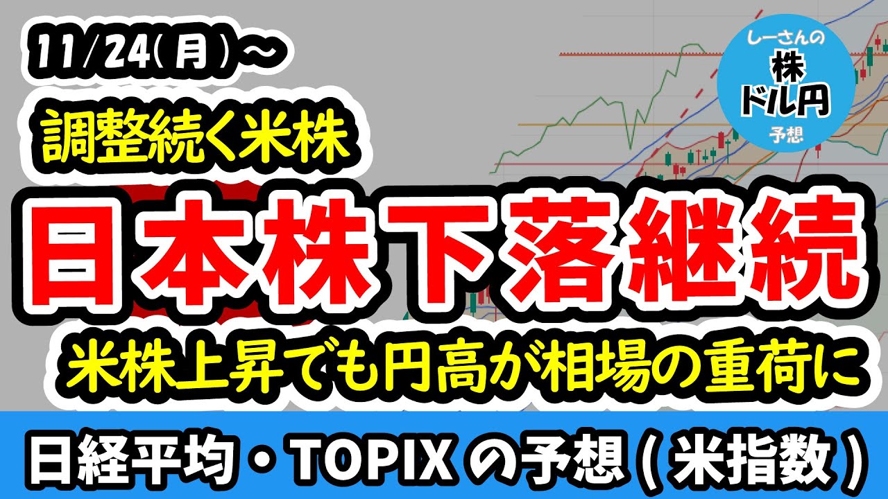 【日経平均・TOPIX】自律反発を挟みながら下落を継続、日経平均とTOPIXには値幅と下落の強さに差が出ると予想!米株は100日単純移動平均線下抜けるかの勝負【週間日本株予想 2025/11/24~】