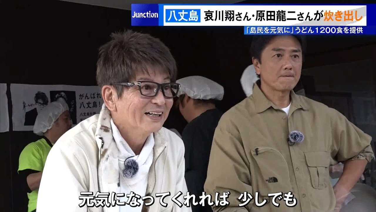はい、どうぞ。 はい、どうぞ。はい、 [音楽] 台風による被害からの復球が続く八条に炊き出しのため訪れたのは俳優の相川翔さんと原田竜二さんです。 はい、ありがとう。はい、どうぞ。 島の観光PRを担う八条大使を務める 2人が京都明日の 2 日間限定で無料の立ち食いうど店を回転。会場には朝から長打の列ができました。なんかちょっと元気になってくれれば [音楽] [音楽] いいかな。少しでもね、大丈夫です。 我々が元気もらっちゃうみたいな。ま、 そういうところもありますよね。 停電や水が続き、 1 ヶ月以上が経つ、今も節水が呼びかけられる不便な暮らしが続く中、 [音楽] 2 人が届けたうどんは当民の心も温めていきます。 美味しい人ます。 おいしいです。です。 うん。 もうちょっとストレスとかでね、胃が痛かったりしてたんですけど、もうどんなら食べれると思ってきたんですけど。 いや、これは身に染みましたね。 遅延の思いを込めたうどんを振る舞う相川さんと原田さんに島民からお礼として思わぬプレゼントも これ明日打ち上げで食べてください。 あ、そう。 はい。 これ八条レモンと ら あの巨大俺レモンやうまいやね。ありがとう。 はい、どうぞ。 いや、結構色々やられたけど、ま、なんとかなります。とか 頑張ってよ。これ食べてこれ食べますか? あ、ごめ。 八条島大使として島の環境美科などの PR を担う相川翔さと島の観光名所である温泉の PR を積極的に行う温泉大使である原田裕二さん。党民と力を合わせて復興を目指します。 [音楽] え、1 人の力ではどうしようもないんでね。1 人がゴミで1 個拾うってことだけでもだいぶ変わってくると思いますんで。 なんかそういうあの気持ちを皆さんに持っていただければすぐ綺麗になると思います。 1 人の多くの方に是非橋島に来ていただいて色々魅力のある温泉種類があります。 露天ブロだけじゃないです。 露天ブロだけじゃないんですよ。室内の風呂もあります。ある。 はい。 なので是非はい。来て入っていただきたいと思います。 明日も午前11時半から午後3時まで行わ れ、今日と合わせて1200色が提供さ れる予定です。