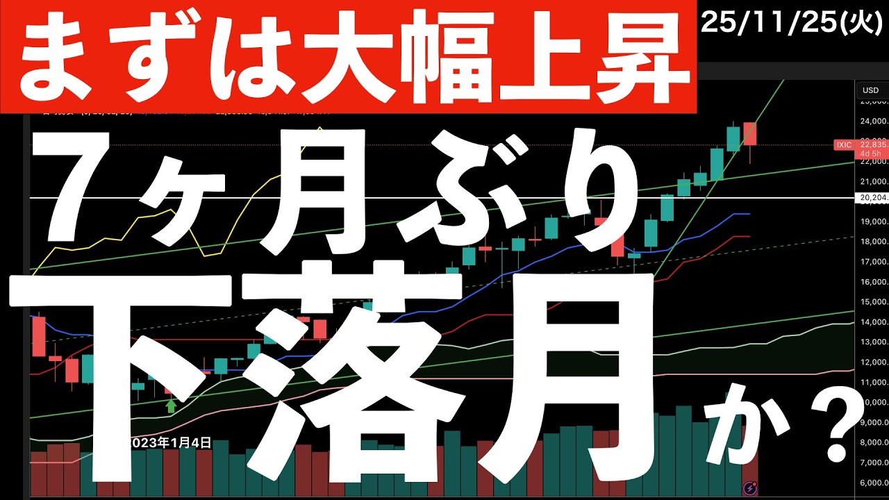 おはようございます。森口でございます。 今日もよろしくお願いいたします。今日は 11月25日火曜日でがこちら。まずは 大幅上昇7ヶ月ぶり下落好きかということ で話をしていきたいという風に思っており ます。え、11月もですね、気がつけば もう最終でございますが、え、ここまでね 、大きく上昇してきた米株、日本株です けども、久々にここまでで陰線をつけて マイナスを記録しておりますが、あと1 週間ありますからね。それが回避できるの かどうかみたいな形で話ができればなと いう風に思いました。今日もよろしくお 願いいたします。ということでこの チャンネルでは最新の状況を取り上げた上 でのテクニカル分析を必ずま、優し目標で 更新をしております。なるべく耳で聞いて も分かるような形でなるべく分かりやすい 言葉を使って解説を続けていきます。毎朝 更新毎日チャート分析チャンネル チャンネル登録を是非よろしくお願いし ます。それでは早速昨日の振り返りから 入っていきましょう。まず日本株と行き たいところですが、日本株はね、祝日の ためお休みでした。なので米株から見て いきたいんですが、金曜日に大きく下げて いたというところを是非覚えといて いただきたいなと思います。で、アメリカ 株なんですけども4時03分時点で しっかりとした上昇になってますよね。中 でもハイテク系Nスタックは2%以上、 ファングプラスも3%近く。特ス4%以上 ですから、え、日経金価中心に反発が期待 できるような上がり方はしてるんじゃない かと思います。欧州株に関しましては 高安まちではありますね。業子別のヒット マップ見るとコミュニケーション、 コンピューター、情報技術やっぱこの辺が 強いなという風に思います。ダウで見ると 、ま、半々といった形なんですが、NST 100で見ると特に大きいところや反動体 がね、え、すごい上がり方してるなという 風に思います。NDIAなんかはそんなで もないんですけど、やっぱここで目立つの はアルファベットとテスラかなが目立って いるのと、え、ちょっとパーセン隠れ ちゃってるんですけど、ブロードコムこれ 10%以上上がってますから非常に強い 展開になっております。ま、その中で日経 先物が800円ぐらいの上昇ですね。 5万円には届かんのかという感じではあり ますけども、ま、ま、とりあえず上昇 スタートはしてくれそうかなというところ でほっとしております。え、顔線に関し まして156円の後半で、え、ビッスは 20は割ってないんだなという感じで ございます。また長期金利に関しましては 今日は結構低下はしているかなという風に 思いますね。で、暗号資産ここが少し反発 をしているリップルイサリアはかなり 大きく反発をしているのでここもなんかね 、センチメントが変わった1個のポイント なのかなという風には感じています。それ では見ていきましょう。11月最終の スタート。ここで上げなければ7ヶ月ぶり の月刊下落になるぞということで話をして いきたいと思います。まずはいつも通り ですがアメリカ株が始まった後の日経新聞 から確認を取っていきましょう。 ニューヨークダウが一体で始まった理由、 追加利下げ観測が相場の支えにということ ですね。もうこの追加利下げで結構左右 する感じがありますね。ねえ、 ニューヨーク連金のウリアムズ総裁の前週 末の公演。ここで多少やっぱ追加利下げの 可能性が高まったっていうところが 引き続きまず意識をされてい るっていうところと 今日に関しましてはウォラーFRB理事の 発言で12月理下げの指示をするていう 姿勢を示したということでした。ね、 オラーリジの発言に関しましては別の記事 でも出ているんですけども、12月理下げ を主張ということではありますが、え、前 週末の入浴連金のその発言っていうのは 入浴連金の総裁の発言というのは比較的 中立高派みたいな人が鳩派的な発言をした ので、だからインパクトがあるという風に 思ったんですけどオラー理事はですね、 元々、ま、次のFRBの公認候補であり 結構、ま、歯とりな発言を最近は多くなっ てきた人ではあるんですよね。だから、ま 、サプライズがあったってことではないと 思うんですけども、え、FOMC技似用師 の中では多くのFRBメンバーが、ま、 12月利下げに慎重だという意見の中で、 ま、12月理下げを指示みたいな、そう いう発言が、ま、連発されたことは、ま、 市場にとっては悪くないニュースではあっ たんじゃないかなという風に思います。ま 、そういったところから金利低下株高配株 みたいなところは起こりやすくはなったん じゃないかと思っています。ただ、ま、 ダウ平均は1巡に伸び悩みみたいなところ もあります。そして、え、今日の夜ですね 、え、9月こういう売上だか、あとは PPI、CPIの発表は見送られました けども、PPIは出るので、ま、そこを見 ておく必要があるのかなという風に思い ました。24日分の経済手指標でいくと アメリカのものはないという形にな