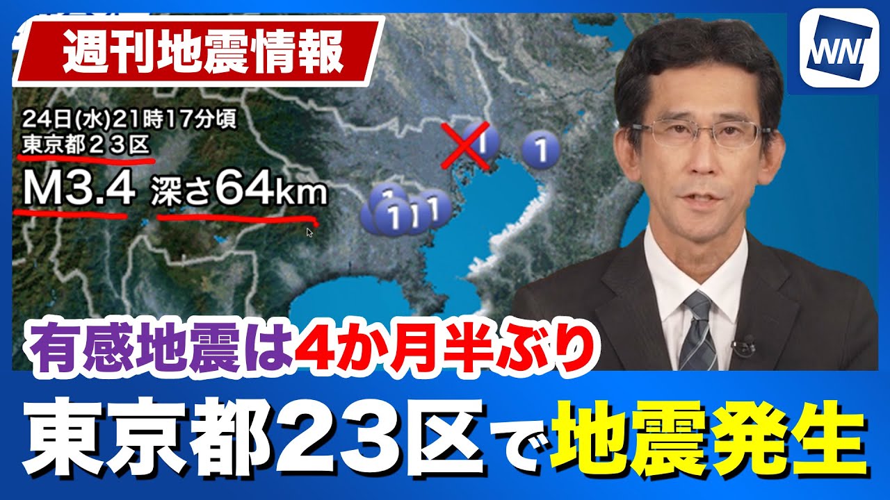 え、1週間の地震についてお伝えする週刊 地震情報です。え、まずこちらの像をご覧 ください。こちらは28日午前10時まで の1週間に発生をしました震度1以上の 地震の信源をポロットしたものになります 。え、この1週間ですけれども震度3以上 の地震は1回発生をしました。ま、この 24日のトカラ東の近海の地震となります 。え、また一方で今1週間の中では東京 23区の、ま、直下で、え、地震の発生も ありました。これは24日の夜に起きた 地震です。え、23区直化を進地震で マグニチュードが3.4、神の深さが 64kmでした。え、この地震で震度1の 入れを、ま、東京江戸川区ですとか、横浜 市の鶴見区、神奈川区、千葉市の花見川区 などで観測をしています。で、この東京 23区の直下なんですけども、大体ですね 、新源の深さが30km前後のところ。 そして70km前後。ま、今回のもそう ですね。あとは120km前後と色々な深 さの場所で地震が起きることがあります。 ま、地下が大変複雑な構造を持ってると 思ったことを表しています。で、1988 年には今回よりもさらに深い場所で マグニチュード5.8と、ま、やや強い 地震が発生しまして、ま、最大震度4、 そして怪我人などの被害が出た事例もあり ます。ま、関東の中でこの23区直化を信 とする地震というのはそれほど発生は多く はありません。え、ただ武器には強い地震 が起きるエリアということになります。 そして次の地震はトカラレッドの地震です 。24日の18時53分頃に起きた地震で は震度3の揺れを、え、観測しました。 マグニチュード3.3、神玄の深さが 7kmとなっています。で、この トカラッド6月から7月にかけてまず髪 地震活動が活発化しました。で、その後 今月に入ってこの諏訪瀬島の辺りで地震が 多発するというのがあったんですけども、 この諏訪之瀬島付近の地震活動はだいぶ 衰えてきてる、静かになってきてる状況 です。で、この24日の新藤さんの地震は 6月から起きておりました。この悪石島の 近くで起きた地震となりまして、ま、6月 からの地震活動だいぶこちらも落ち着いて きた中でまだ続いているということを示し ております。ま、このトワラッド、こちら は、ま、火山の、ま、島も多くあるエリア です。ま、この24日の地震は火山活動に は特に大きな関係はないかという風に見 られますけども、この諏訪瀬島地震活動が 落ち着いてきたとはいえ、23日頃からは 、え、噴火が続いております。ま、噴火に 関しては当面の間は注意を要するといった 状況が続きそうです。そして最後に海外の 地震です。USGSアメリカ地質調査書が 決定したマグニチュード4.5以上の地震 の信源をポロットしたものです。で、この 1週間ですけれども、大きな地震としまし てはこの南米ベネズエラの北部で起きた 地震が上げられます。え、マグニチュード が6.3というものが日本時間の9月25 日の昼過ぎに発生をしています。え、また この前の、これより前の、え、25日の朝 にはほぼ同じ場所でマグニチュード6.2 の地震がありました。信源の深さも、ま、 大体、ま、10km前後と浅い場所で起き ておりまして、ま、地標付近では震度、ま 、5ですとか、あの、6弱に該当するよう な、ま、日本の震動階級するとそれぐらい の大変強い揺れに見舞われた可能性があり ます。で、このベネズエラ北部ですけれど も、こちらは南アフリカプレートとカリブ プレートの教会に位置をしておりまして、 ま、教会に沿う形で規模の大きな地震が 時寄り発生する領域です。1997年には 今回よりも少し東側の領域で マグニチュード7.0の大きな地震が起き た事例もあります。 え、最新の国内の地震情報ですとか海外の 地震に関するニュースについてはお天気 アプリウェザーニュースでもご覧いただき ます。 [音楽]