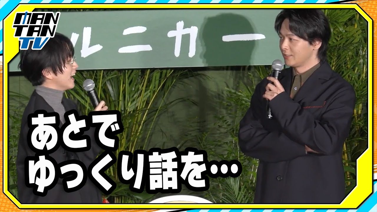 田丸ひ役垣ひさんお願いいたします。 はい。え、た丸ひを演じましたひです。本日はお運びくださって本当にありがとうございます。え、行して、あの、今から上映ということで皆様の元にこの作品届くこと本当に嬉しく思います。是非楽しんでいっていただけたら嬉しいです。よろしくお願いします。 [音楽] ありがとうございます。 続きまして、よし木啓介役中村智さんです。お願いします。 どうもよ木役の中村です。え、楽しんでてください。お願いします。 よろしくお願いします。中村さんから見たい垣さんご本人に関して伺いたいなと思うんですが、アフレコでご一緒されて感じたことを、ま、こう あって感じたことかがですか?板垣さん、中村さんについて。 えっと、初めましてがアフレコの前にこうとポスターとかに使う [音楽] ビジュアル撮ったり、あと予告で使う音声ちょっと本当一言 2言ぐらいセリフ入れた が初めましてだったんですけど うん なんかあれ前お会いしてたっけぐらいのあの壁のなさというか [音楽] すいませんでした フランクさで 本当に僕が小学生ぐらい の時によく遊んでくれてた お兄ちゃんぐらいのと久しぶりに会った あ みたいな感覚にさせてくれて うん。 なんかそれってやっぱりこうやってたまるとよしとしてあの深い絆をこう気づき上げていかないといけない中でその壁のなさっていうの僕はすごくありがたかったしになりましたね。 [音楽] はい。 人見知りなんだって。 めちゃ人見知りです。はい。 ねえ。 俺関係なく言っちゃうから人見させる暇もなく そうその隙がな 横にいるみたいな はい気づいたら横にいらっしゃいました いやありがとうございますも確 警戒されることもたまにあるんで本当ですか キャラはい 中村さんから見て垣さんはいかがです あのね可愛い子だなってずっと思ってたんすよ前で可愛くていい子だなってことが分かってで色々取材 とかも経て、あの、ちゃんと一くあっていいなって思ってるんです。最近。 ちょっとそこ詳しく聞いてもいいですか?癖せの部。 いや、だから勝手に心配してる。 え、 なんかこの可愛らしいね、ものと うん。 こう求められるのと自分のギャップとかたまに感じて辛いのかなとか勝手に心配してる。 ああ、ちょっと後でゆっくりだ。本当なんか文章とか書いて欲しいんですよ、僕は。 あ、文章書くの好きです。結構 なんかなんかね、本とか出してほしい。 おお。 ちょっとじゃあ それ読んでますとした。 はい。 僕も一緒だよみたいな感じでみたい。 本ん当ですか? ありがとうございます。 その一癖はどういう時に感じるんですか? いや、なんかね、僕がもう 1 癖以上ある人間なんですけど、もう皆さん分かったかもしれませんが頷くんじゃないよ。 そっち も元がだいぶひねくれてるもんでやっぱ そのなんですかね?レーダーがあるのか わかんないですけどなんかちゃんとたまに いるんすよ。本当にこの子本当にずっと いい子だなみたいな芸能の人。 芸能の方いい。ずっといい子だねお前 みたいな。逆になんか落ち着かないんです よね。そういう人と一緒にいるとなんか 自分のなんかなんか煩悩みたいなものを 映し鏡で見せられてるような気持ちになっ てでちゃんとなんかだから具体的なこと 言い出すもあれ感覚なんすけどあちゃん なんか家で1人でいる時に考えてることと かあるんだろうなみたいな変論が見える とすっごい落ち着くのああ考えてますねん と一緒にインタビューは2人で インタビューけた時に はい。 その私の一っていうのがあって うん。うん。 そこで出したのがその江戸川ランポの短編だったんですよね。 へえ。 物を変愛する その 人形とか鏡とか はい。そこにちょっとあのあと思いました。あ、 そうなんですよ。中学ぐらいの時に うん。 ランポと出会っちゃったんですけど うん。 あの、多な時期に江戸川ランポの二重とかじゃなくって 結構短片のそのちょっとドぎつめな うん。 のと出会ってしまうと確かにそれは癖は生まれるかもしれない。 はい。 いや、だってすごい今後が楽しみなんです。勝手に年上だから偉そうに言わしてもらいますけど。 いや、ありがとうございます。 多分いろんな面白い二役のやつとか見たいね。声優だけで。 ああ、なるほど。 の方さっきいたんで うん。 なんか プッシュしていきましょ。 二役やるのとかみたい。はい。 ごめん。長く話い。いいんです。いいんです。あのランポ好きな方はちょっとなるほどっていう感じがしました。はい。 うん。ありがとうございます。