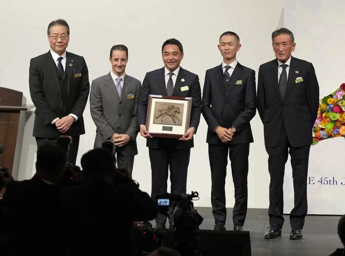 イクイノックスが顕彰馬セレモニーで表彰されポーズをとる(左から2人目から)ルメール、シルクレーシング・米本代表、木村師、ノーザンファーム・吉田勝己代表。左端はJRA・吉田理事長(撮影・郡司 修)