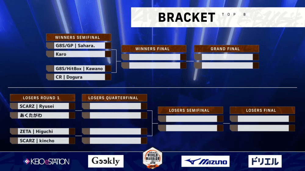 トップ8は、ウイナーズ側はさはら、Karo、カワノ、どぐら、ルーザーズ側はりゅうせい、あくたがわ、ひぐち、きんちょ。「SFL」参戦チームやプロ選手が大勢を占める中で、「Evo Japan」や「GRAPHT CUP」などにも参戦し、今大会で頭角を現した無所属のKaroと、「LEGENDUS」でSHAKAとともにマノンで優勝した無所属のあくたがわが名を連ねた。