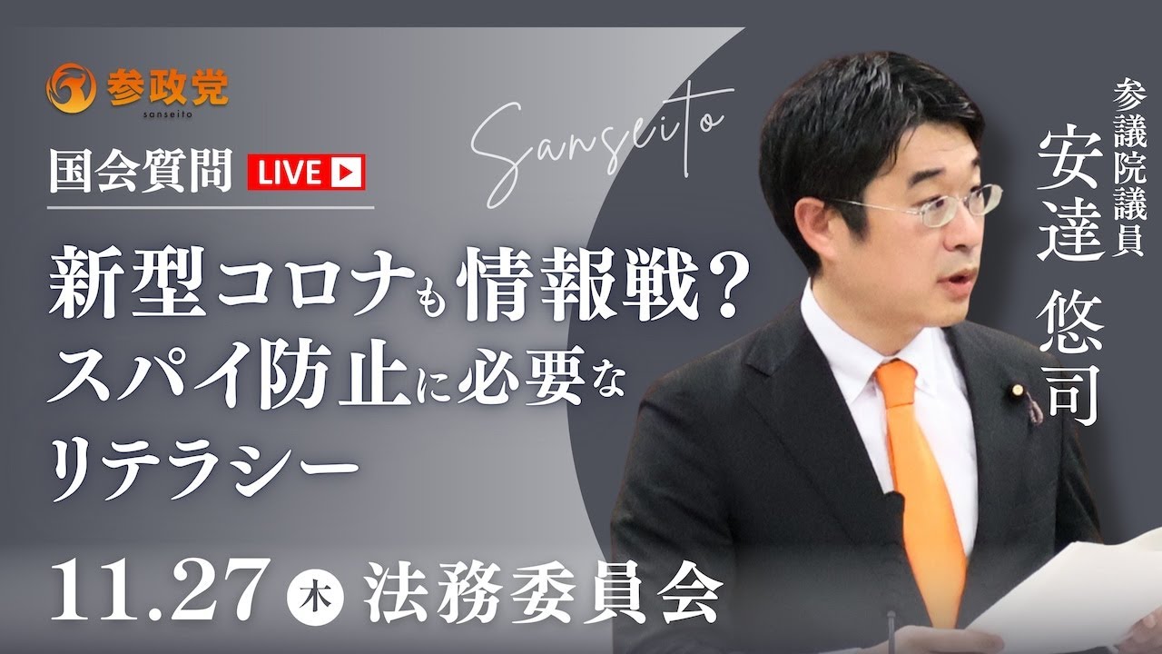 【国会中継】「新型コロナも情報戦?スパイ防止に必要なリテラシー」参議院議員 安達悠司 国会質疑 令和7年11月27日 参政党