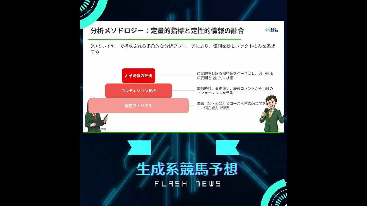 皆さん、こんにちは。生成系競馬予想チャンネルへようこそ。進行役のジェンバです。 解説役の相バです。今回もデータと分析でレースを丸裸にしていきますよ。 さあ、相葉さん、今回はしの大 1 番勝王冠です。え、愛予測と徹底分析で高期待値の馬を見つけ出しました。それではまずは本日の流れをご紹介します。 はい、まずは私たちの分析アプローチをご説明し、その後メインの勝王冠、そしてその他の注目レースの水奨場を解説します。最後に全水奨場を一覧でまとめますので、是非最後までご覧ください。 まずは大前提として私たちが狙うお解読場についてです。 ええ、私たちが定義するお解読場とは単に強い馬ではありません。史上のおつがその馬の本来の強さ、つまり真の勝率を正しく反映していない、いわゆるおつに歪みなが生じている馬のことです。この帰りこそが私たちの収益の厳選となります。 [音楽] その歪みをどうやって見つけるのか私たちの分析手法がこちらです。 私たちの分析はこの3 階層で構成されています。土台となるのは血糖やコース、適正といった不遍的なデータ。 その上に調京の動きや急車コメントといった直前のコンディション情報を重ね。そして頂点に位置するのがこれら全てを統合した AI による予測地です。この多格的なアプローチで憶測を排除しファクトのみを追求します。 それではお待たせしました。メインレース勝王冠の分析に入ります。 [音楽] 南関東のチャンピオンコース大い 1800m が舞台です。実力がそのまま結果に結びりつきやすい紛れの少ないコースですよ。 そして私たちが絶対の自信を持って推奨するのがこのウキングストンボーイです。 勝利へのフラグは3 つあります。まずは血闘背景。父ンテの 3 区はこのくらいの距離でこそ進化を発揮します。次に適正への回機。前走のマイル戦での配線は明確な距離不足。今回はベストの 1800m に戻ります。そして最後に外級を使った万全の長京過家庭。奇球後の動きは素晴らしくまさに万全の体制です。 もちろん他にも強い馬はいますよね。ライバルはどうでしょう? はい。比較してみましょう。ライトウォーリアは昨年 2着、1昨年1 着と適正は抜群で強敵です。 3 カ馬ミックファイアも副調気配ですが、完全復活には疑問が残ります。乱王も自分の庭ですがトップスピードの質でキングストンボーイに見踊りします。総合的に見てキングストンボーイの優位は揺がないと判断します。 メインレース以外にもお買読場はまだまだいますよ。 はい、特にこの4等に注目です。5 レースのライドハは想定勝率 40%と能力が抜けています。3 レースの思い出の後先は給容を挟んで大きく成長。 そして2レースのマーナーパスと12 レースのマのジーニはAIが450% を超える脅異的な回収期待値を弾き出しています。大穴の可能性がありますよ。 それでは本日の水勝場全 6等をまとめました。 こちらが本日の投資対象リストです。レース番号名イそして最も重要な AI による想定勝率と回収期待値です。特にキングストンボーイと思い出の後先ライド配は投資水度です。評価となっています。ご自身の予算に合わせて賢く資金を配分してください。 いかがでしたか?データと分析が導き出す後期待値の世界。皆さんの馬券のお役に立てれば嬉しいです。 競馬は感情ではなく事実と向き合うことで勝利に近づきます。本日の分析が皆様の敵中につがることを願っています。 それではまた次回チャンネル登録もよろしくお願いします。 y