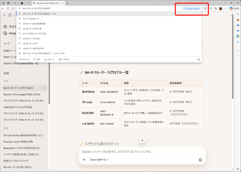 Copilotはサイドバーだけでなく、アドレスバーでも利用できる。アドレスバーに質問を入力後、右側に表示された「Copilot Search」(TAB+EnterでもOK)をクリックすると、Copilotが起動して回答が表示される。回答はインターネット上の情報を元にしているため、最新情報などにも答えてくれる。