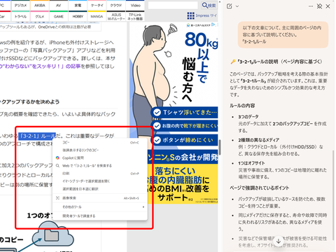 現在のEdgeで一番注目されているのは、やはりCopilotを利用したAI機能だ。サイドバーや右クリックのメニューなど、さまざまなところにCopilotが組み込まれており、多彩な用途にAIの力を活用できる。