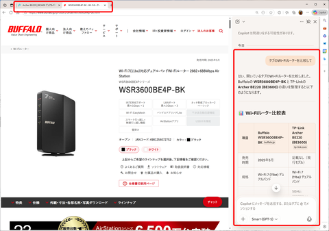 まず、サイドバーのCopilotから、複数タブについて質問できる。たとえば2つの製品を比較したいときなどに、それぞれの製品をタブで開いておき、Copilotに比較を依頼すると、両方のタブから情報を取得して、回答を表示してくれる。