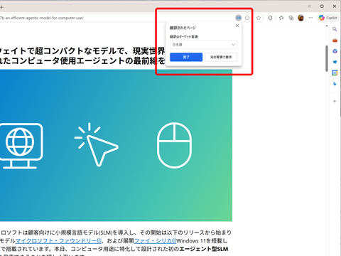 開いているWebページを翻訳する機能は、今や珍しくないが、もちろんEdgeでも利用できる。海外サイトの情報を参照する場合に便利だ。