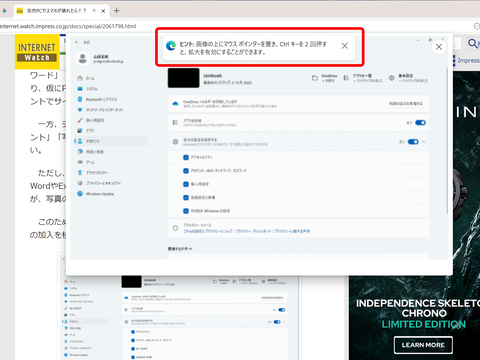 Webページの画像を大きく表示する機能も搭載されている。具体的には、Webページ上の画像にマウスカーソルを合わせ、「Ctrl」キーを2回押すと、画像を拡大できる。