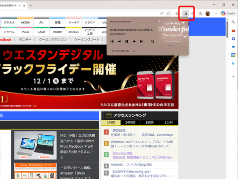 動画や音楽などを再生すると、自動的にツールバーに表示されるのが、メディアコントロールセンターのアイコンだ。このアイコンを利用して、メディアの再生をコントロールできるため、YouTube Musicで音楽を再生しながら、別のタブでWebページを参照することもできる。